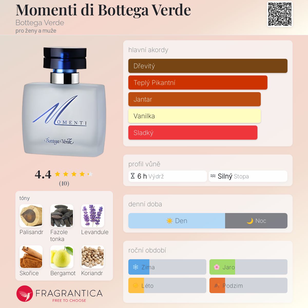 Momenti di Bottega Verde podle Bottega Verde je Aromatic Spicy vůně pro ženy a muže. Vrchní tóny jsou Bergamot a Koriandr; střední tóny jsouPalisandr, Levandule, Skořice, Růže, Konvalinka, Zelené tóny a Šeřík ; základní tóny jsou Fazole tonka, Santalové dřevo, Vanilka a Pižmo.