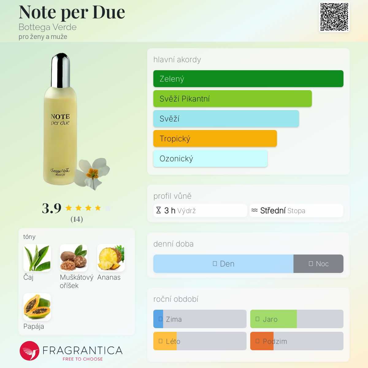 Note per Due podle Bottega Verde je Aromatic Fruity vůně pro ženy a muže. Note per Due byla spuštěna během 2000. Vrchní tóny jsou Ananas a Papája; střední tón jeZelený čaj ; základní tón je Muškátový oříšek.