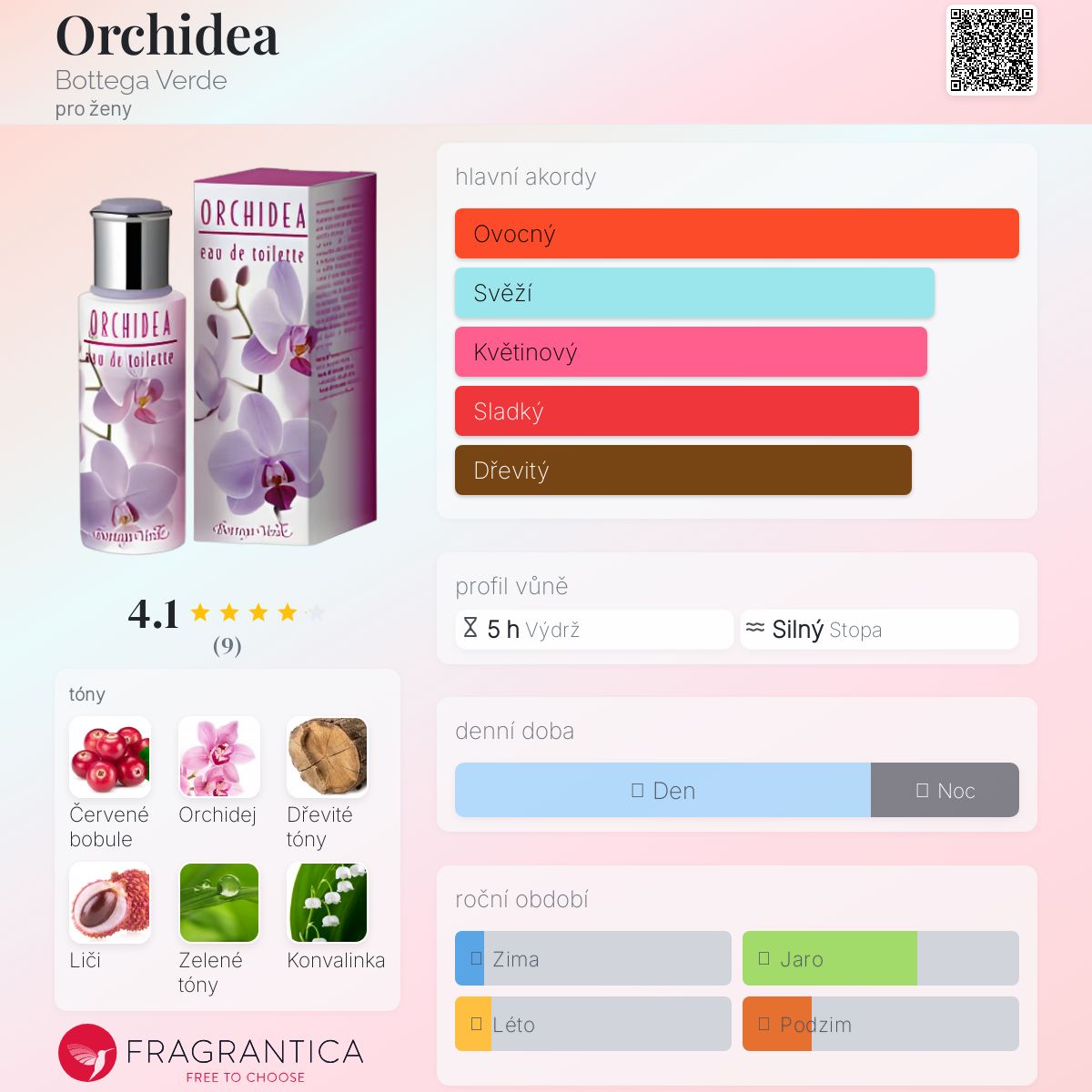 Orchidea podle Bottega Verde je Floral Woody Musk vůně pro ženy. Vrchní tóny jsou Červené bobule, Liči a Zelený tón; střední tóny jsouOrchidej, Konvalinka, Růže a Jasmín ; základní tóny jsou Vzácné dřevo, Pižmo a Vanilka.