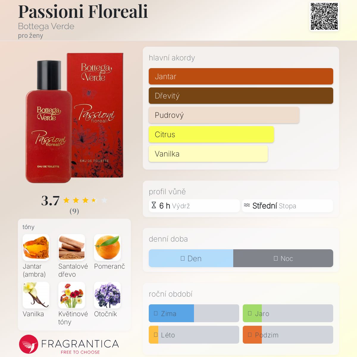 Passioni Floreali podle Bottega Verde je vůně pro ženy. Vrchní tóny jsou Bílý jantar (ambra), Sladký pomeranč a Vanilka; střední tóny jsouKvětinové tóny, Otočník a Tuberóza ; základní tóny jsou Santalové dřevo, Ambroň, Pačuli a Kašmírové dřevo.