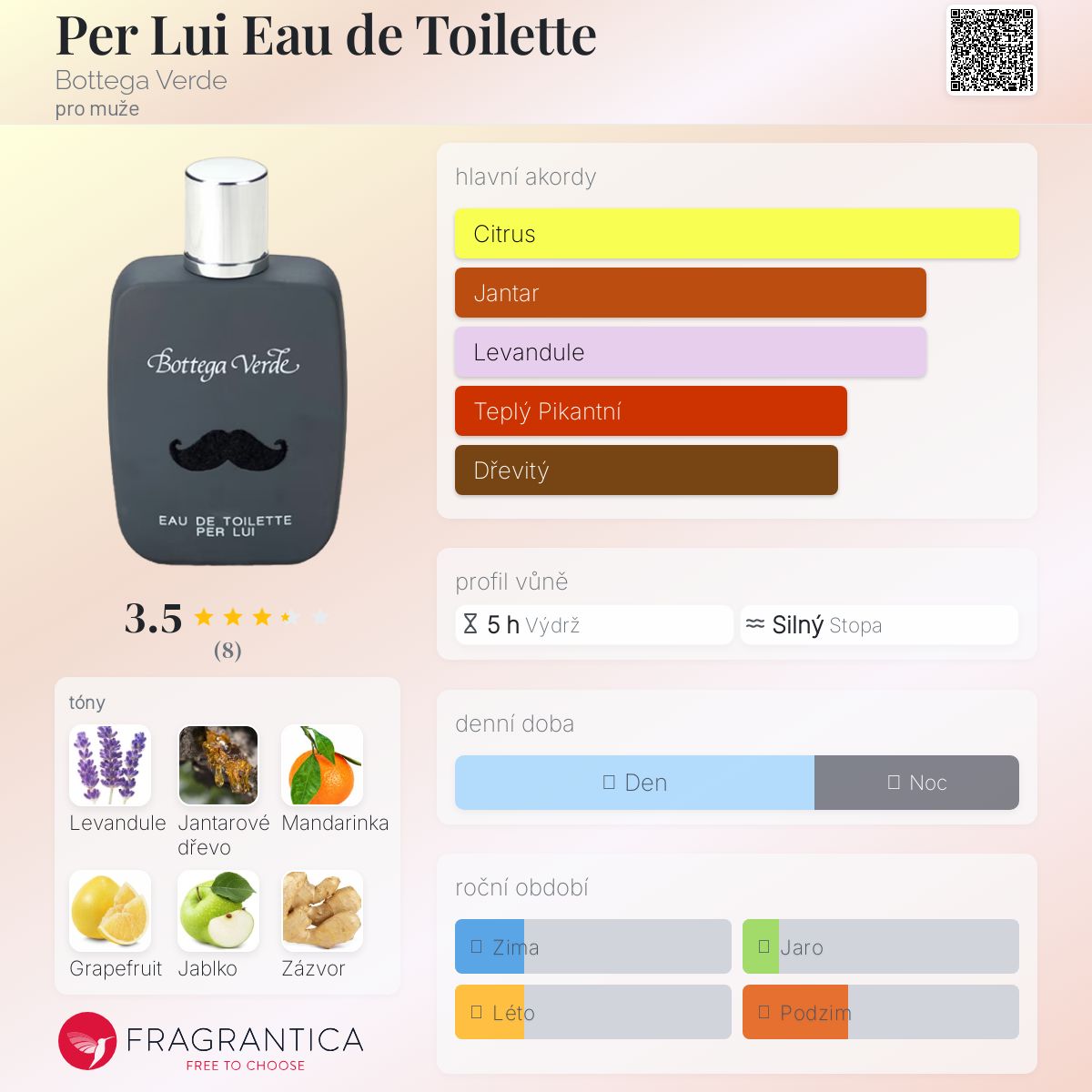 Per Lui Eau de Toilette podle Bottega Verde je Citrus Aromatic vůně pro muže. Per Lui Eau de Toilette byl/a uveden/a v roce 2017. Vrchní tóny jsou Mandarinka, Grapefruit a Zelené jablko; střední tóny jsouLevandule, Zázvor a Pomerančový květ ; základní tóny jsou Jantarové dřevo, Fazole tonka a Vanilka.