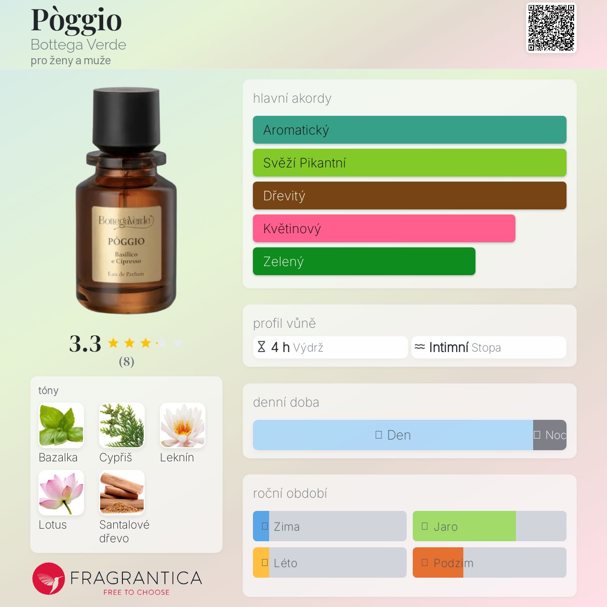 Pòggio podle Bottega Verde je vůně pro ženy a muže. Toto je nová vůně. Pòggio byl/a uveden/a v roce 2025. Vrchní tón je Bazalka ; střední tóny jsouLeknín a Lotus ; základní tóny jsou Cypřiš a Santalové dřevo.