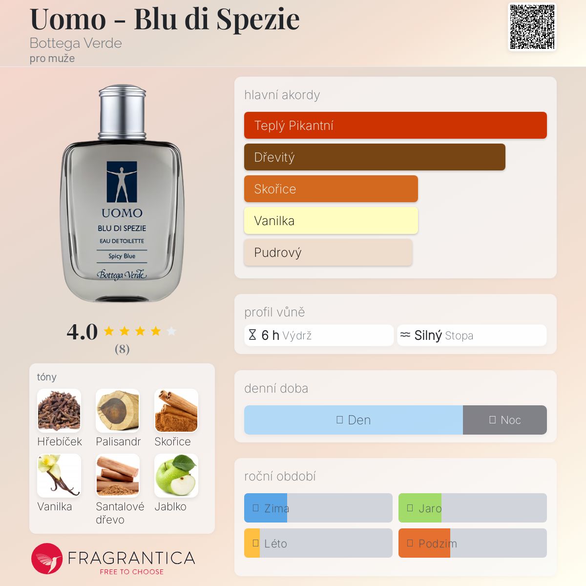 Uomo - Blu di Spezie podle Bottega Verde je Woody Spicy vůně pro muže. Vrchní tóny jsou Jablko, Citrón a Bergamot; střední tóny jsouHřebíček, Palisandr, Skořice a Karafiát ; základní tóny jsou Vanilka, Santalové dřevo, Cedr a Vetiver.
