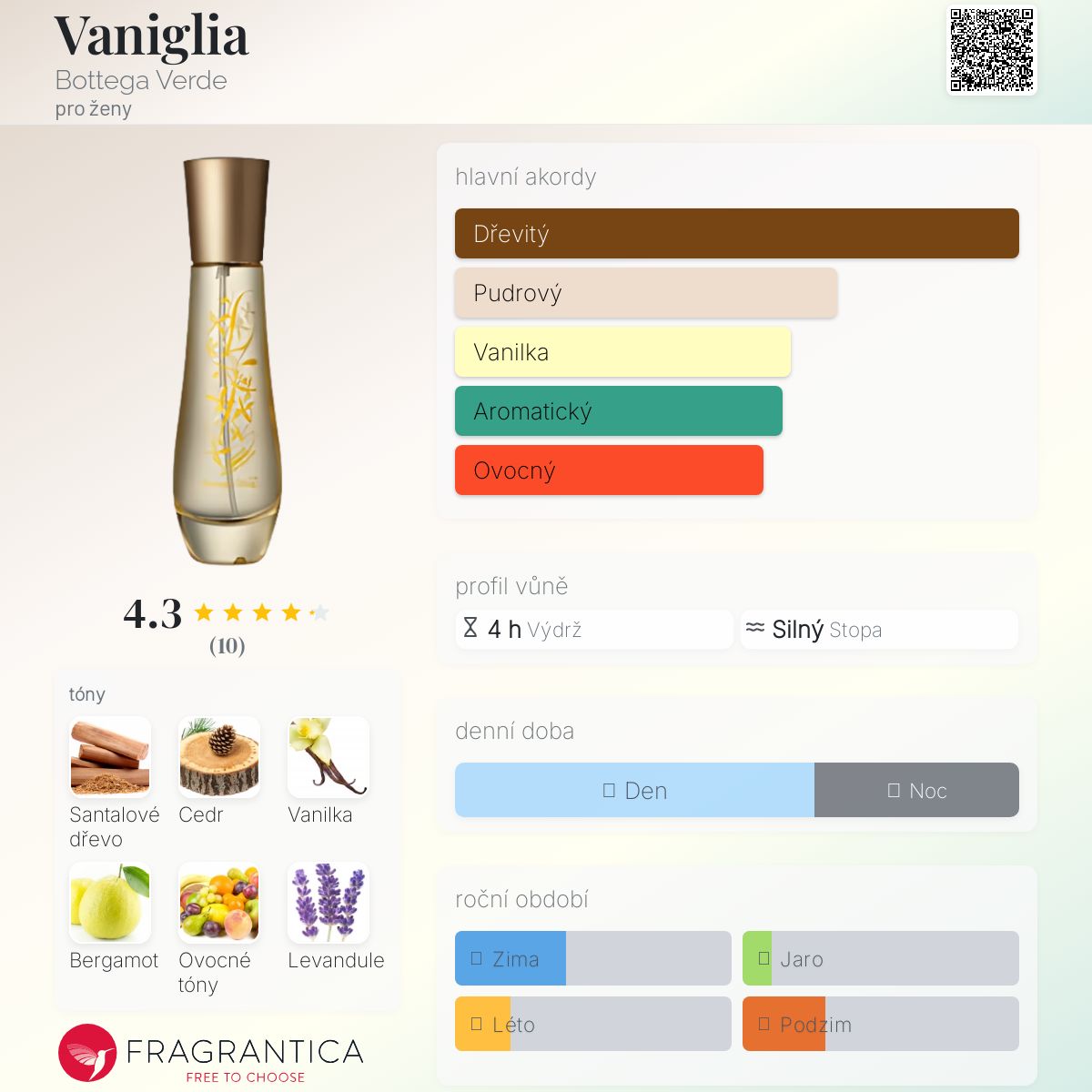 Vaniglia podle Bottega Verde je Aromatic Fruity vůně pro ženy. Vaniglia byla spuštěna během 2000. Vrchní tóny jsou Bergamot, Levandule a Estragon; střední tóny jsouSantalové dřevo a Cedr ; základní tóny jsou Vanilka a Ovocné tóny.