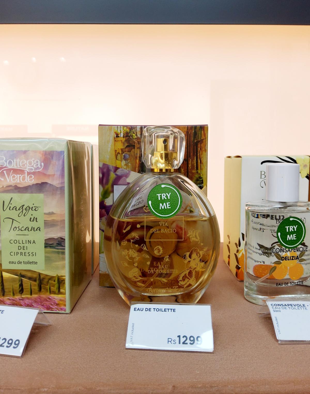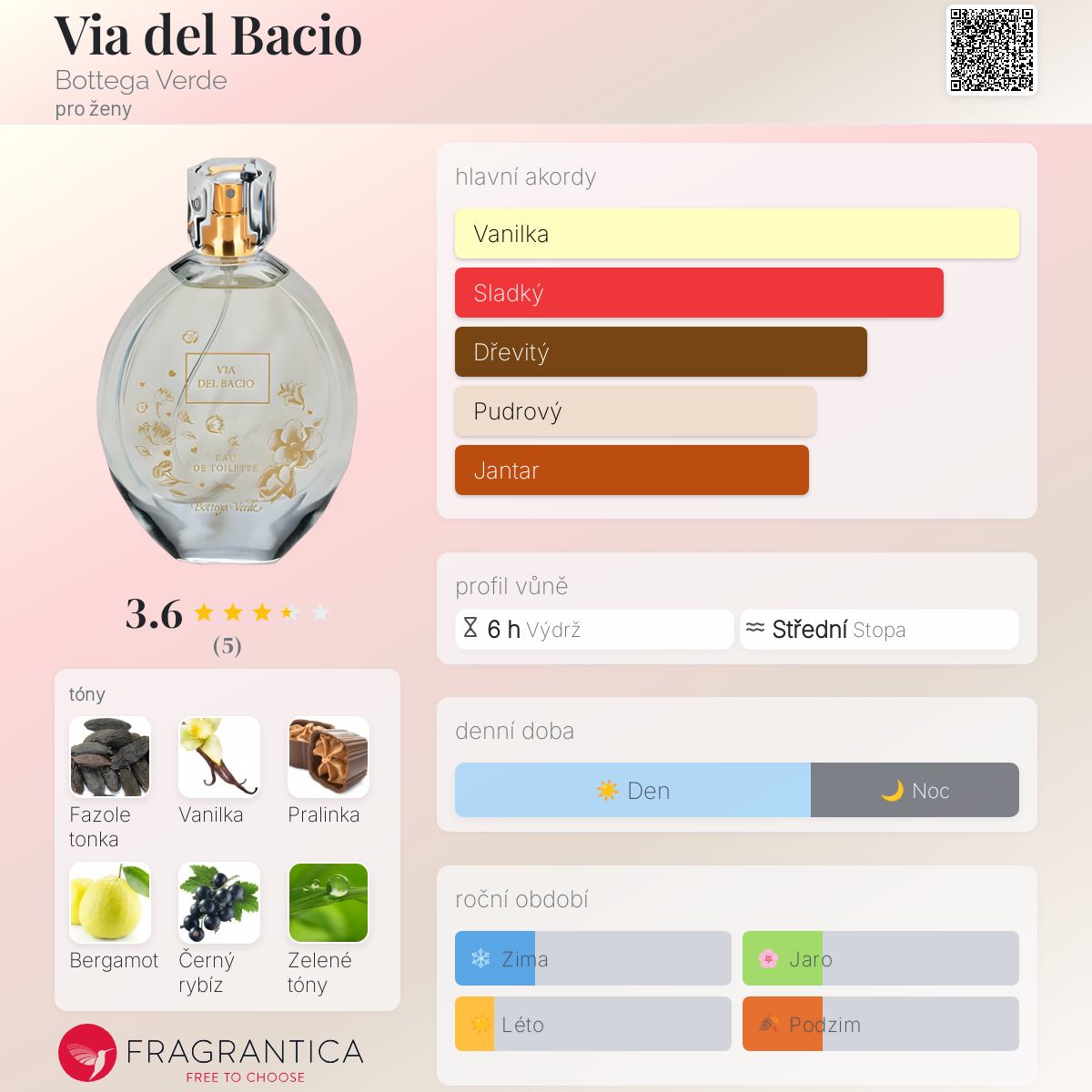 Via del Bacio podle Bottega Verde je Floral Fruity Gourmand vůně pro ženy. Vrchní tóny jsou Bergamot, Černý rybíz a Zelené tóny; střední tóny jsouKonvalinka, Kosatec a Pomerančový květ ; základní tóny jsou Fazole tonka, Vanilka, Pralinka, Pačuli, Cedr a Santalové dřevo.
