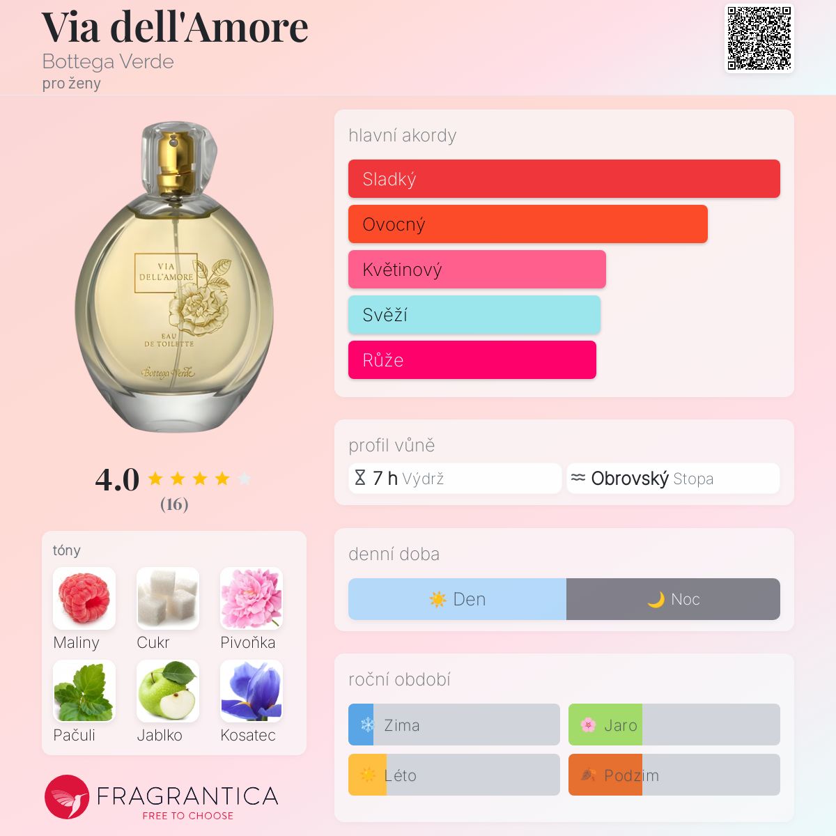 Via dell'Amore podle Bottega Verde je vůně pro ženy. Via dell'Amore byl/a uveden/a v roce 2015. Vrchní tóny jsou Maliny, Zelené jablko a Grapefruit; střední tóny jsouPivoňka, Kosatec a Pomerančový květ ; základní tóny jsou Cukrová třtina, Pačuli a Cedr.