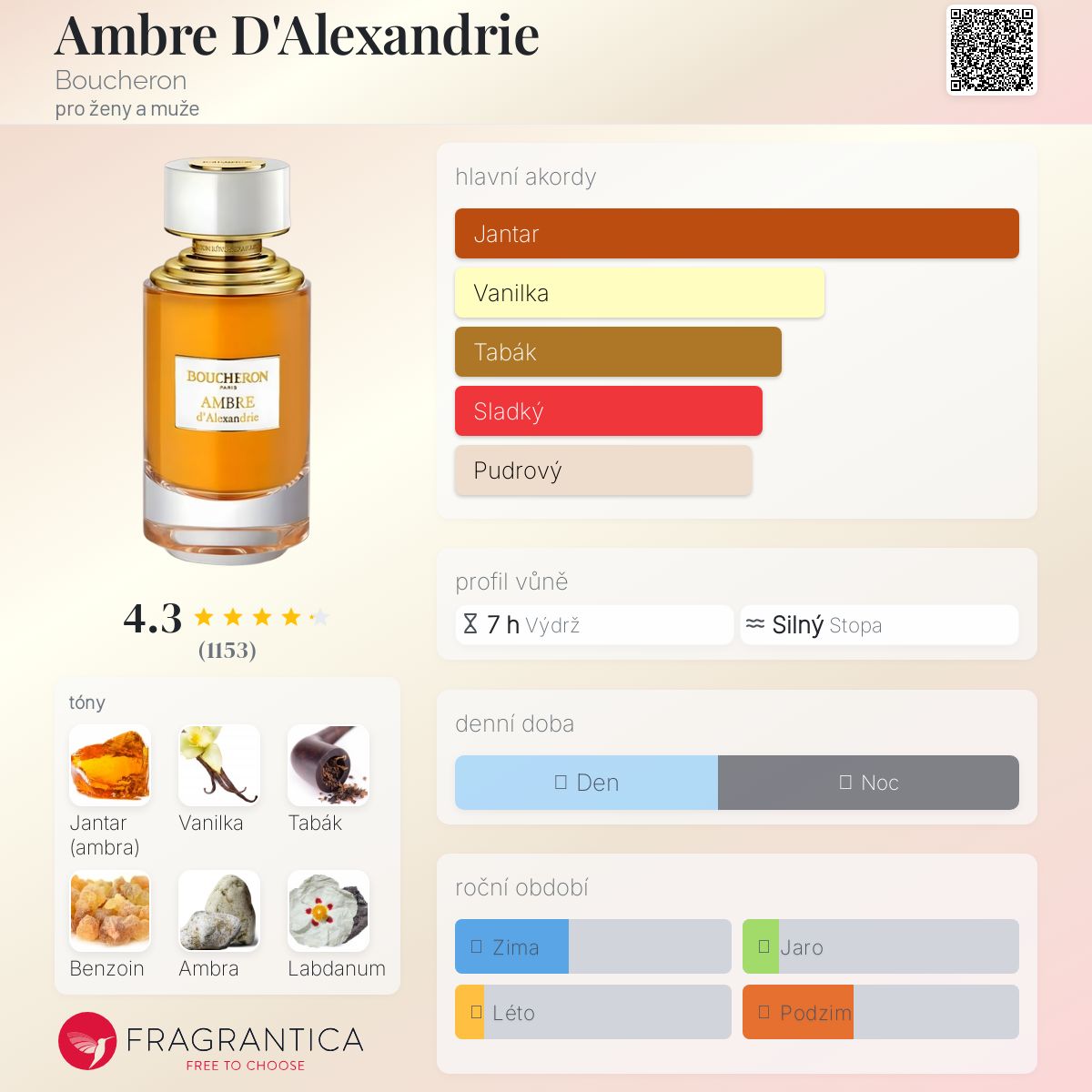 Ambre D'Alexandrie podle Boucheron je Orientální vůně pro ženy a muže. Ambre D'Alexandrie byl/a uveden/a v roce 2017. "Nosem" za touto vůní je Jean-Christophe Hérault. Vrchní tóny jsou Vanilka, Tabák a Benzoin; střední tóny jsouJantar (ambra) a Labdanum ; základní tóny jsou Ambra a Pižmo.