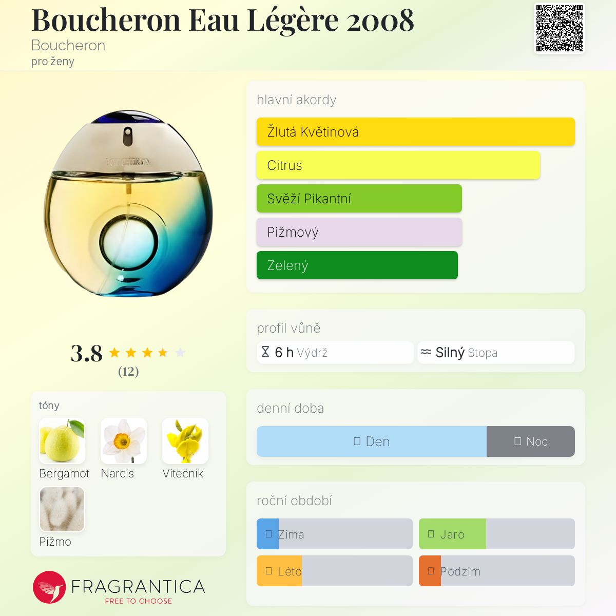Boucheron Eau Légère 2008 podle Boucheron je Floral Woody Musk vůně pro ženy. Boucheron Eau Légère 2008 byl/a uveden/a v roce 2008. Vrchní tón je Bergamot ; střední tóny jsouNarcis a Janovec ; základní tón je Pižmo.