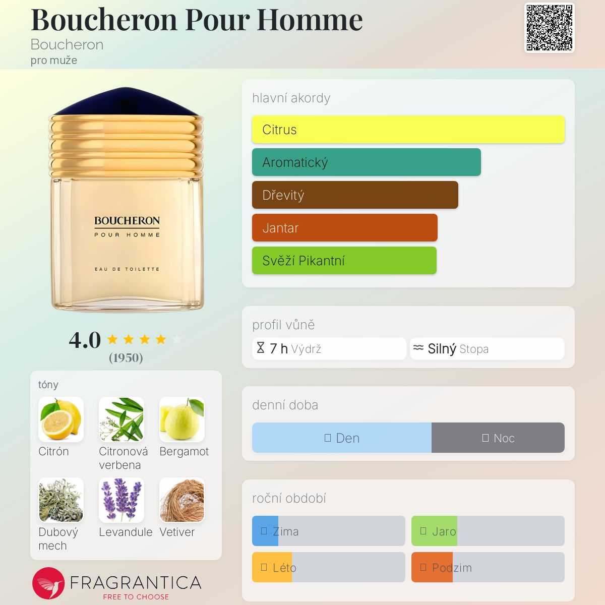 Boucheron Pour Homme podle Boucheron je Citrus Aromatic vůně pro muže. Boucheron Pour Homme byl/a uveden/a v roce 1991. Boucheron Pour Homme byl/a vytvořen/a Francis Deleamont, Jean-Pierre Bethouart a Raymond Chaillan. Vrchní tóny jsou Citrón, Citronová verbena, Bergamot, Levandule, Pomeranč, Bazalka a Mandarinka; střední tóny jsouKarafiát, Růže, Jasmín, Ylang-Ylang, Konvalinka a Kořen orris ; základní tóny jsou Dubový mech, Vetiver, Santalové dřevo, Kadidlo, Pižmo, Benzoin, Jantar (ambra) a Fazole tonka.