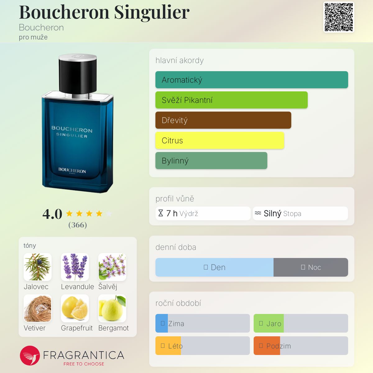 Boucheron Singulier podle Boucheron je vůně pro muže. Boucheron Singulier byl/a uveden/a v roce 2022. "Nosem" za touto vůní je Caroline Dumur. Vrchní tóny jsou Jalovec, Grapefruit a Bergamot; střední tóny jsouLevandule, Šalvěj a Pelargónie ; základní tóny jsou Vetiver, Pačuli a Cedr.