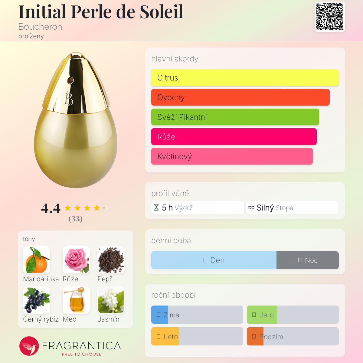 Initial Perle de Soleil podle Boucheron je Orientální vůně pro ženy. Vrchní tóny jsou Mandarinka a Černý rybíz; střední tóny jsouRůže, Pepř, Jasmín a Pačuli ; základní tóny jsou Med, Vanilka a Jantar (ambra).