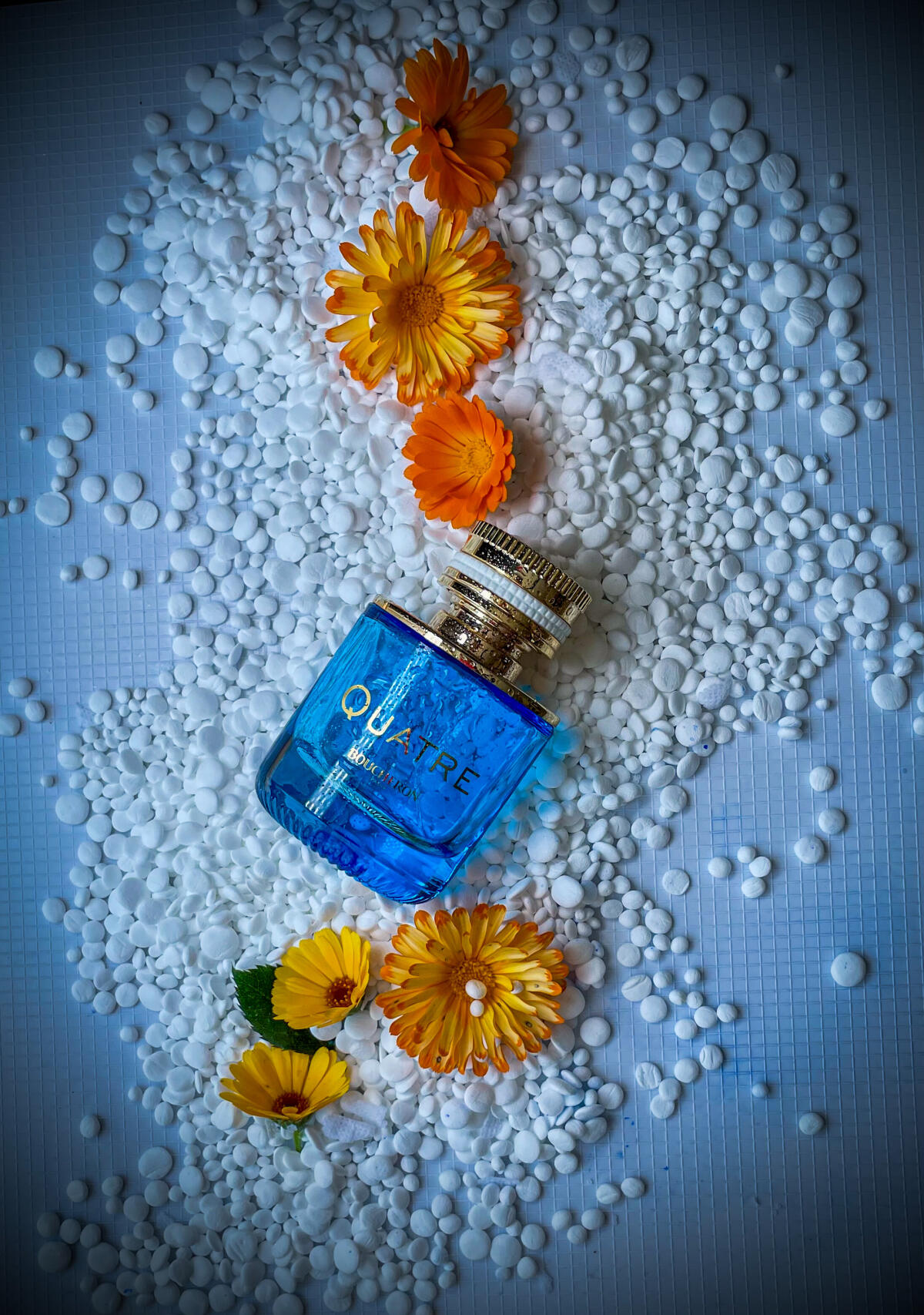 Quatre en Bleu podle Boucheron je Floral Woody Musk vůně pro ženy. Quatre en Bleu byl/a uveden/a v roce 2021. "Nosem" za touto vůní je Sonia Constant. Vrchní tóny jsou Bergamot, Citrón a Mandarinka; střední tóny jsouEgyptský jasmín, Tuberóza a Růže ; základní tóny jsou Dřevo akigala, Pižmo a Santalové dřevo.