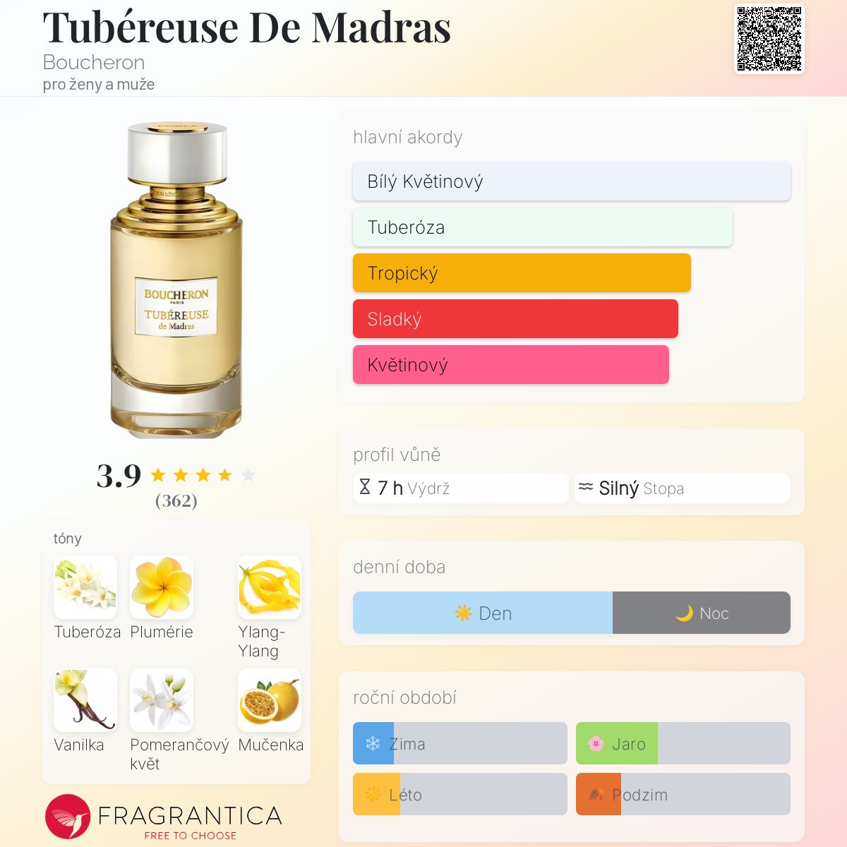 Tubéreuse De Madras podle Boucheron je Orientální Floral vůně pro ženy a muže. Tubéreuse De Madras byl/a uveden/a v roce 2017. "Nosem" za touto vůní je Christophe Raynaud. Vrchní tóny jsou Pomerančový květ, Mučenka a Fialkový list; střední tóny jsouTuberóza, Plumérie a Ylang-Ylang ; základní tóny jsou Tuberóza, Vanilka a Santalové dřevo.