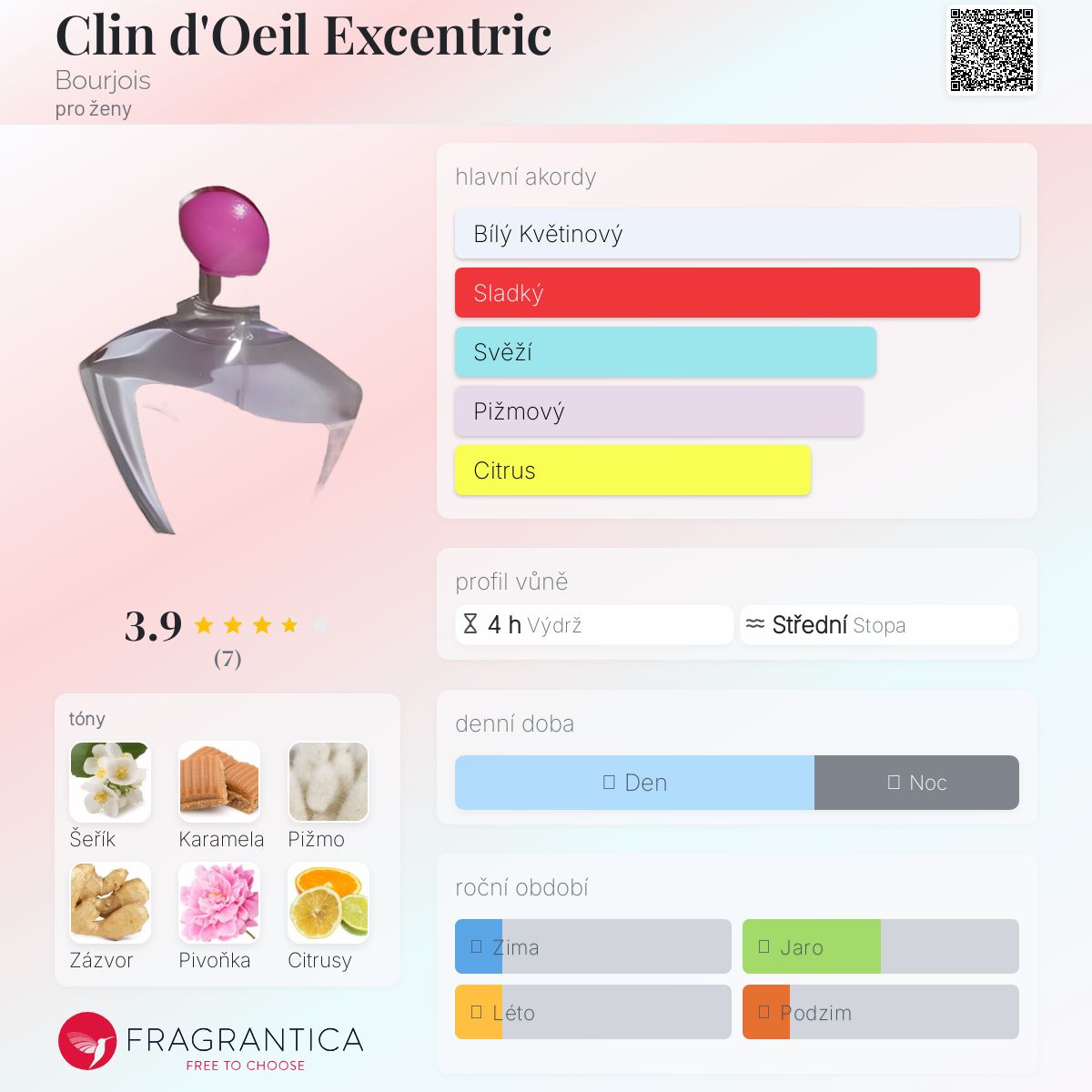Clin d'Oeil Excentric podle Bourjois je Citrus Gourmand vůně pro ženy. Clin d'Oeil Excentric byl/a uveden/a v roce 2001. Vrchní tóny jsou Zázvor, Citrusy a Grapefruit; střední tóny jsouŠeřík, Karamela a Pivoňka ; základní tón je Pižmo.