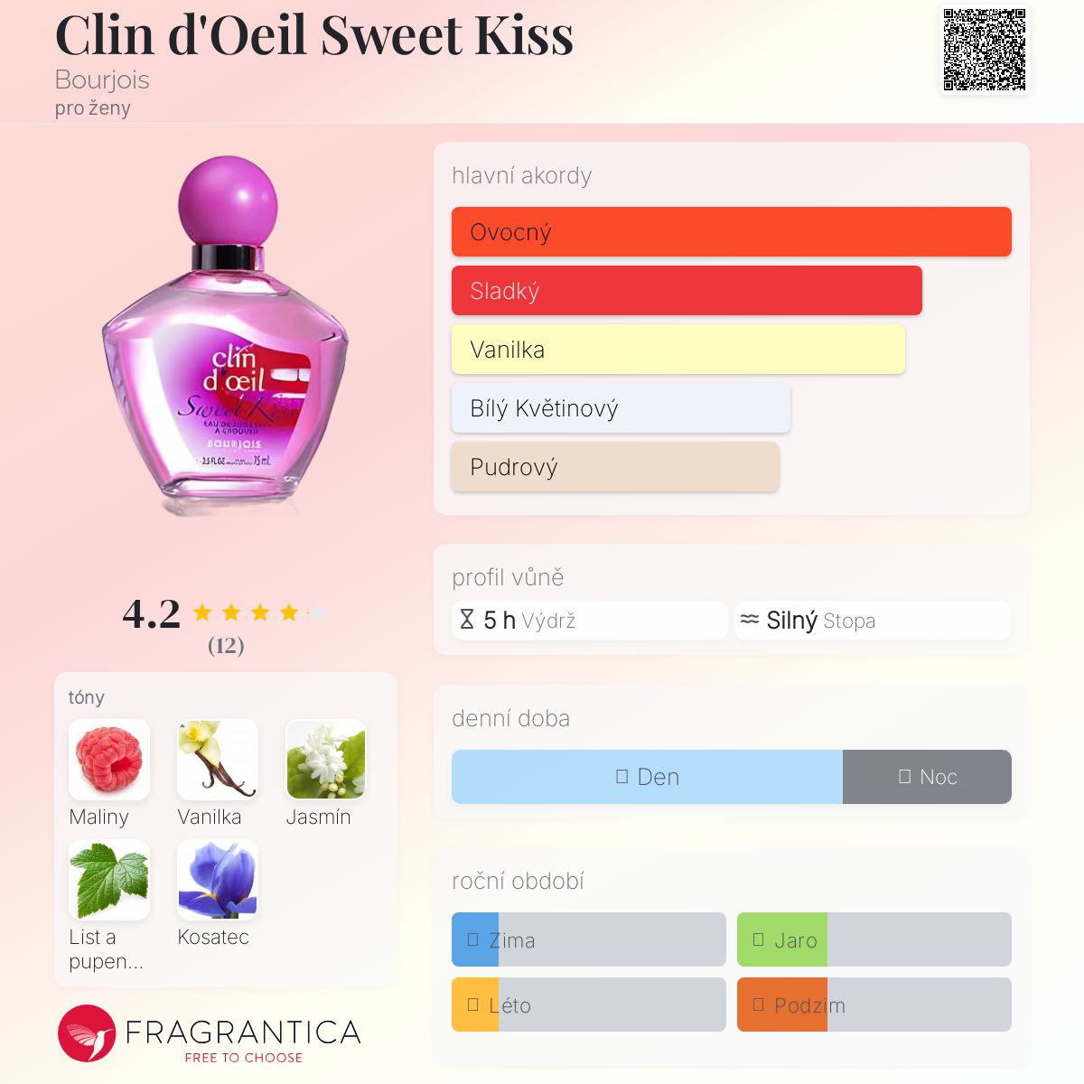 Clin d'Oeil Sweet Kiss podle Bourjois je Floral Fruity Gourmand vůně pro ženy. Clin d'Oeil Sweet Kiss byl/a uveden/a v roce 2008. Vrchní tóny jsou Maliny a Černý rybíz; střední tóny jsouJasmín a Kosatec ; základní tón je Vanilka.