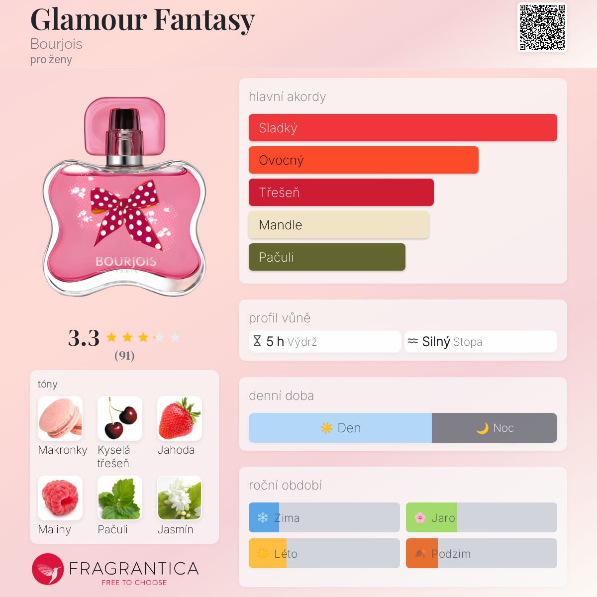 Glamour Fantasy podle Bourjois je Chypre Fruity vůně pro ženy. Glamour Fantasy byl/a uveden/a v roce 2013. Vrchní tóny jsou Makronky, Kyselá třešeň a Maliny; střední tóny jsouVelká jahoda a Jasmín Sambac ; základní tón je Pačuli.