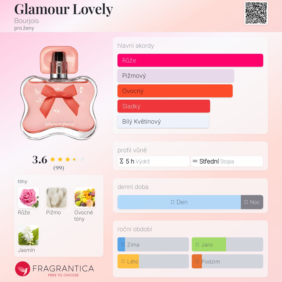 Glamour Lovely podle Bourjois je Floral Fruity vůně pro ženy. Glamour Lovely byl/a uveden/a v roce 2013. Vrchní tón je Ovocné tóny ; střední tóny jsouTurecká růže a Jasmín Sambac ; základní tón je Pižmo.