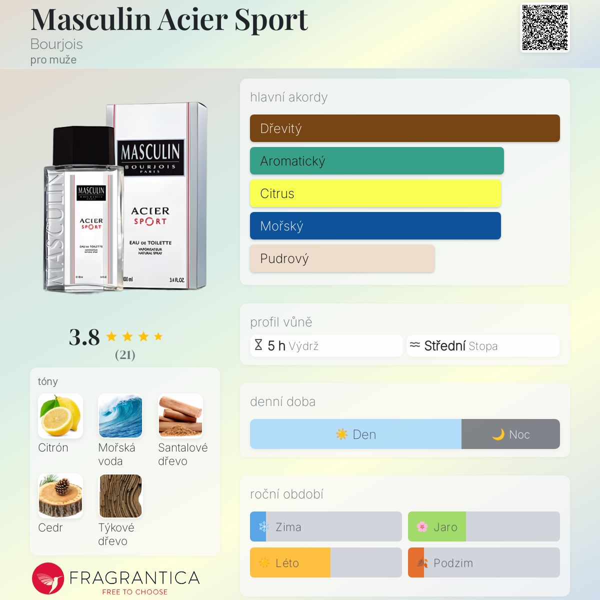 Masculin Acier Sport podle Bourjois je Aromatic Spicy vůně pro muže. Masculin Acier Sport byl/a uveden/a v roce 2004. Vrchní tón je Citron amalfi ; střední tóny jsouVirginský cedr a Týkové dřevo ; základní tóny jsou Mořská voda a Santalové dřevo.