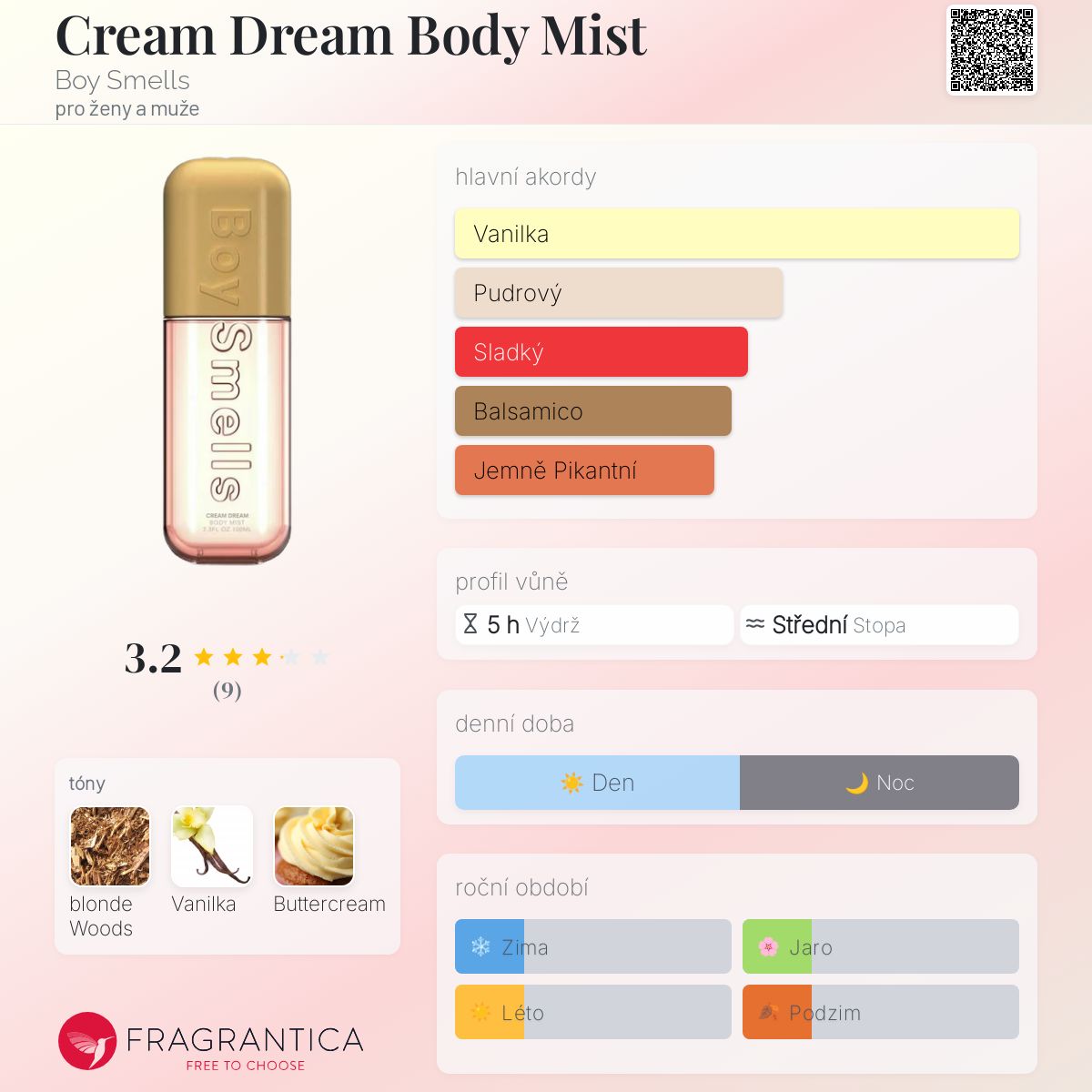 Cream Dream Body Mist podle Boy Smells je Orientální Vanilla vůně pro ženy a muže. Toto je nová vůně. Cream Dream Body Mist byl/a uveden/a v roce 2025. Vrchní tón je Vanilka ; střední tón jeMáslový krém ; základní tón je Světlá dřeva.