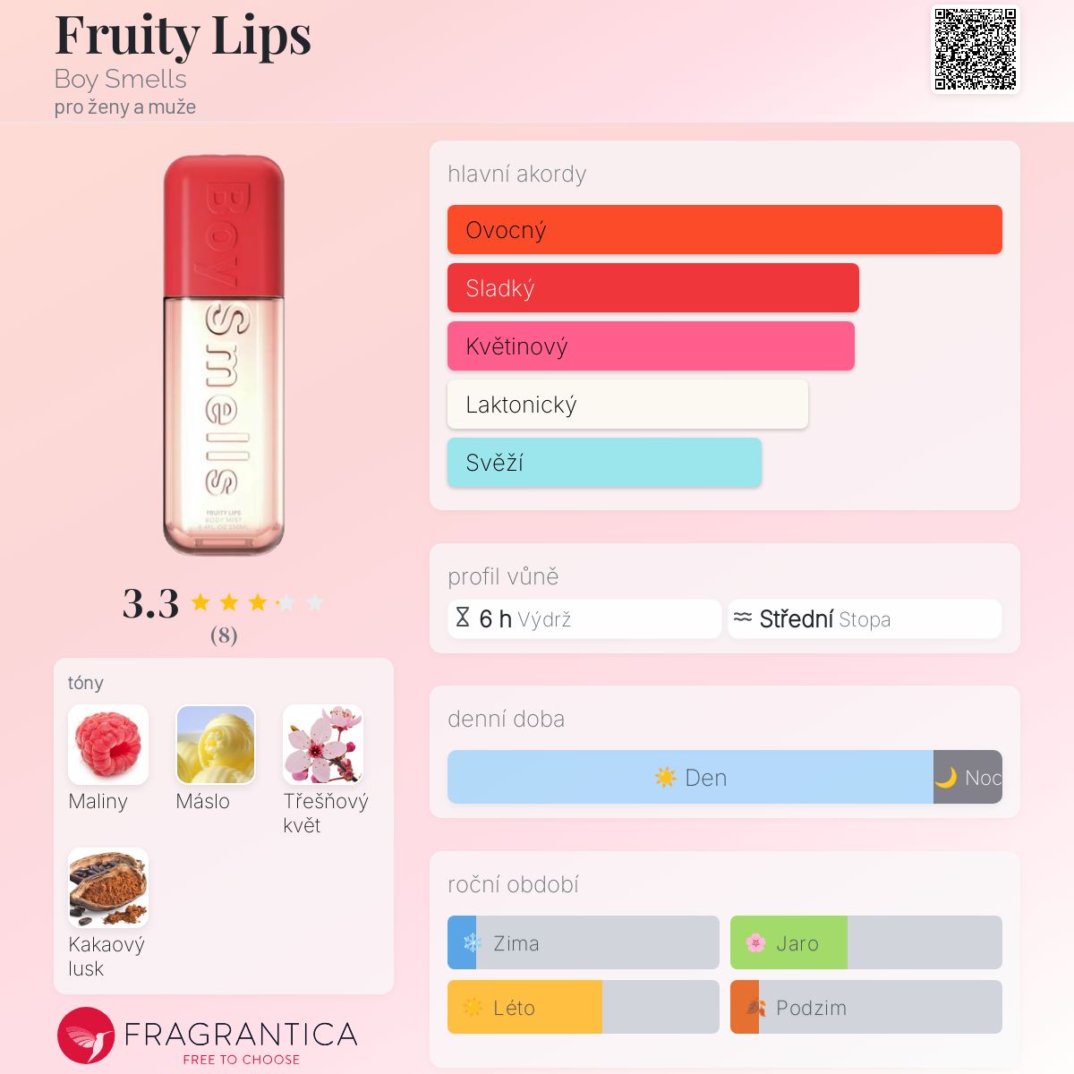 Fruity Lips podle Boy Smells je vůně pro ženy a muže. Toto je nová vůně. Fruity Lips byl/a uveden/a v roce 2025. "Nosem" za touto vůní je Jacques Huclier. Vrchní tón je Maliny ; střední tón jeTřešňový květ ; základní tóny jsou Máslo a Kakao.
