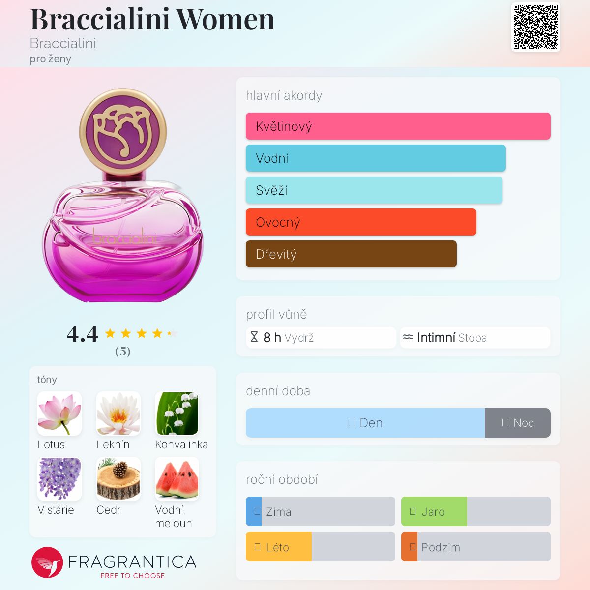 Braccialini Women podle Braccialini je Floral Fruity vůně pro ženy. Braccialini Women byl/a uveden/a v roce 2008. Vrchní tóny jsou Vodní meloun, Hruška, Zelené jablko a Karambola; střední tóny jsouLotus, Leknín, Konvalinka, Vistárie a Lipový květ ; základní tóny jsou Cedr, Pižmo, Jantar (ambra) a Santalové dřevo.