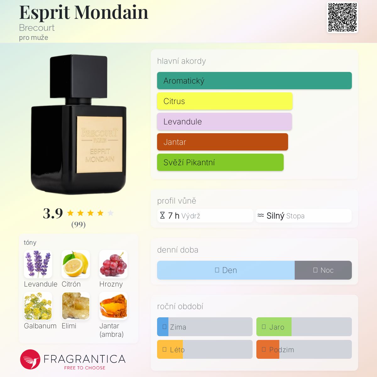Esprit Mondain podle Brecourt je Orientální Woody vůně pro muže. Esprit Mondain byl/a uveden/a v roce 2010. "Nosem" za touto vůní je Emilie Bouge. Vrchní tóny jsou Citron amalfi , Galbanum a Pepř; střední tóny jsouLevandule, Hrozny, Elimi, Estragon a Červené víno ; základní tóny jsou Jantar (ambra), Myrha, Virginský cedr a Pižmo.