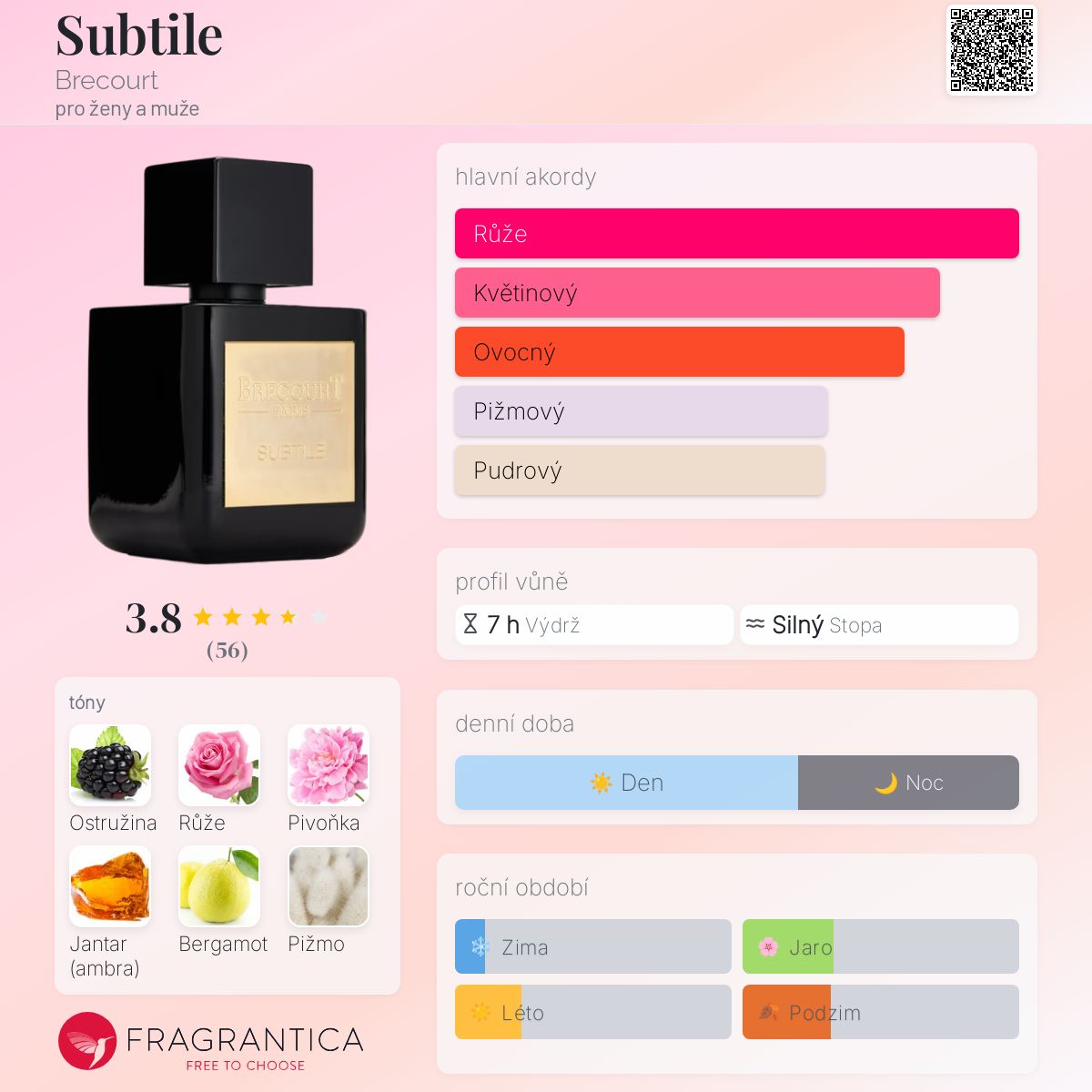 Subtile podle Brecourt je Floral vůně pro ženy a muže. Subtile byl/a uveden/a v roce 2018. Vrchní tóny jsou Růže, Pivoňka a Bergamot; střední tóny jsouOstružina, Růže a Pačuli ; základní tóny jsou Jantar (ambra), Pižmo a Santalové dřevo.