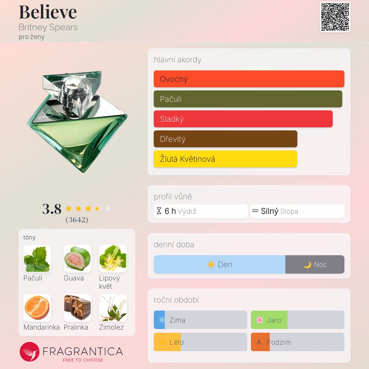 Believe podle Britney Spears je Floral Fruity vůně pro ženy. Believe byl/a uveden/a v roce 2007. Vrchní tóny jsou Guava a Mandarinka; střední tóny jsouLipový květ a Zimolez ; základní tóny jsou Pačuli, Pralinka a Jantar (ambra).