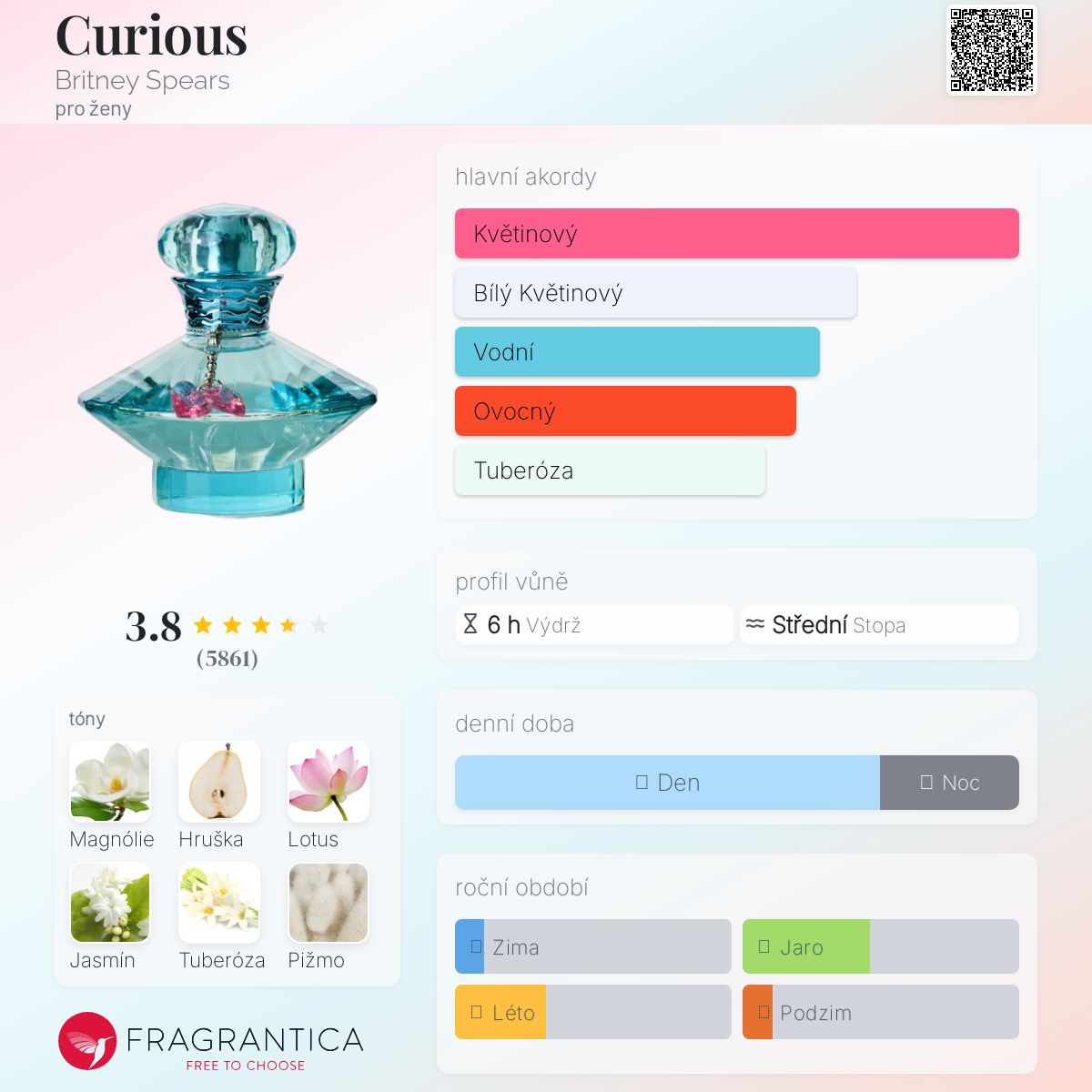 Curious podle Britney Spears je Floral vůně pro ženy. Curious byl/a uveden/a v roce 2004. "Nosem" za touto vůní je Claude Dir. Vrchní tóny jsou Magnólie, Hruška a Lotus; střední tóny jsouJasmín, Tuberóza a Brambořík ; základní tóny jsou Pižmo, Vanilka, Bílé dřevo a Santalové dřevo.