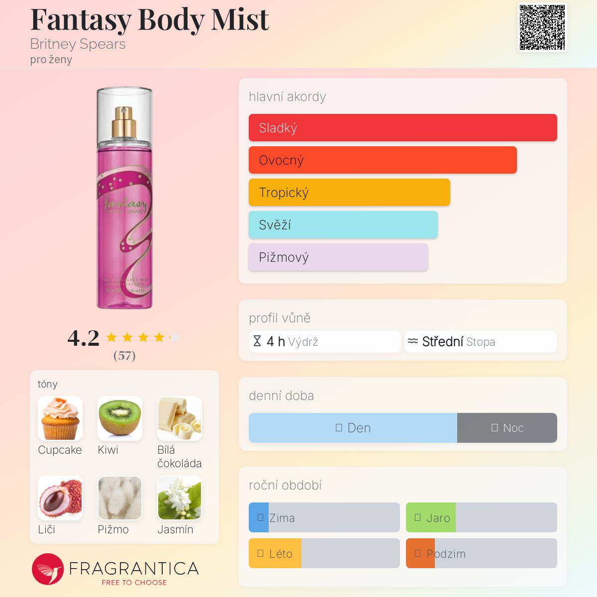 Fantasy Body Mist podle Britney Spears je Floral Fruity Gourmand vůně pro ženy. "Nosem" za touto vůní je James Krivda. Vrchní tóny jsou Kiwi, Červené liči a Kdoule; střední tóny jsouCupcake, Bílá čokoláda, Jasmín a Orchidej ; základní tóny jsou Pižmo, Dřevité tóny a Kořen orris.