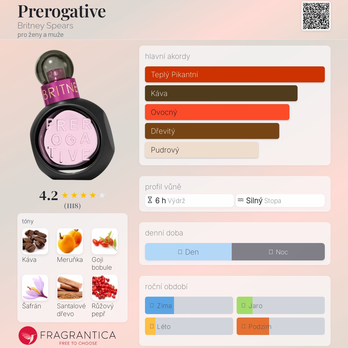 Prerogative podle Britney Spears je Orientální Vanilla vůně pro ženy a muže. Prerogative byl/a uveden/a v roce 2018. Vrchní tóny jsou Meruňka, Goji bobule a Růžový pepř; střední tóny jsouKáva, Šafrán a Červená lilie ; základní tóny jsou Santalové dřevo a Jantarové dřevo.