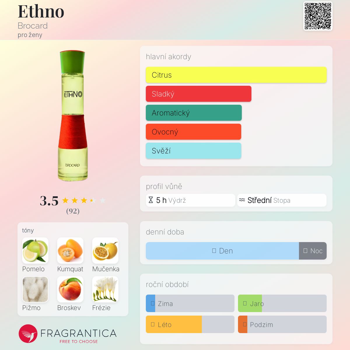 Ethno podle Brocard je Floral Fruity vůně pro ženy. Vrchní tóny jsou Pomelo, Mučenka a Vodní meloun; střední tóny jsouKumquat, Frézie a Pivoňka ; základní tóny jsou Pižmo, Broskev a Růže.