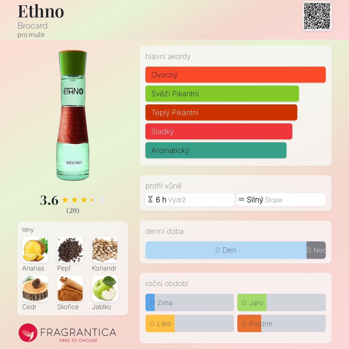 Ethno podle Brocard je Aromatic Fruity vůně pro muže. Vrchní tóny jsou Ananas, Koriandr a Jablko; střední tóny jsouPepř, Skořice a Pomerančový květ ; základní tóny jsou Cedr, Jantar (ambra) a Vanilka.