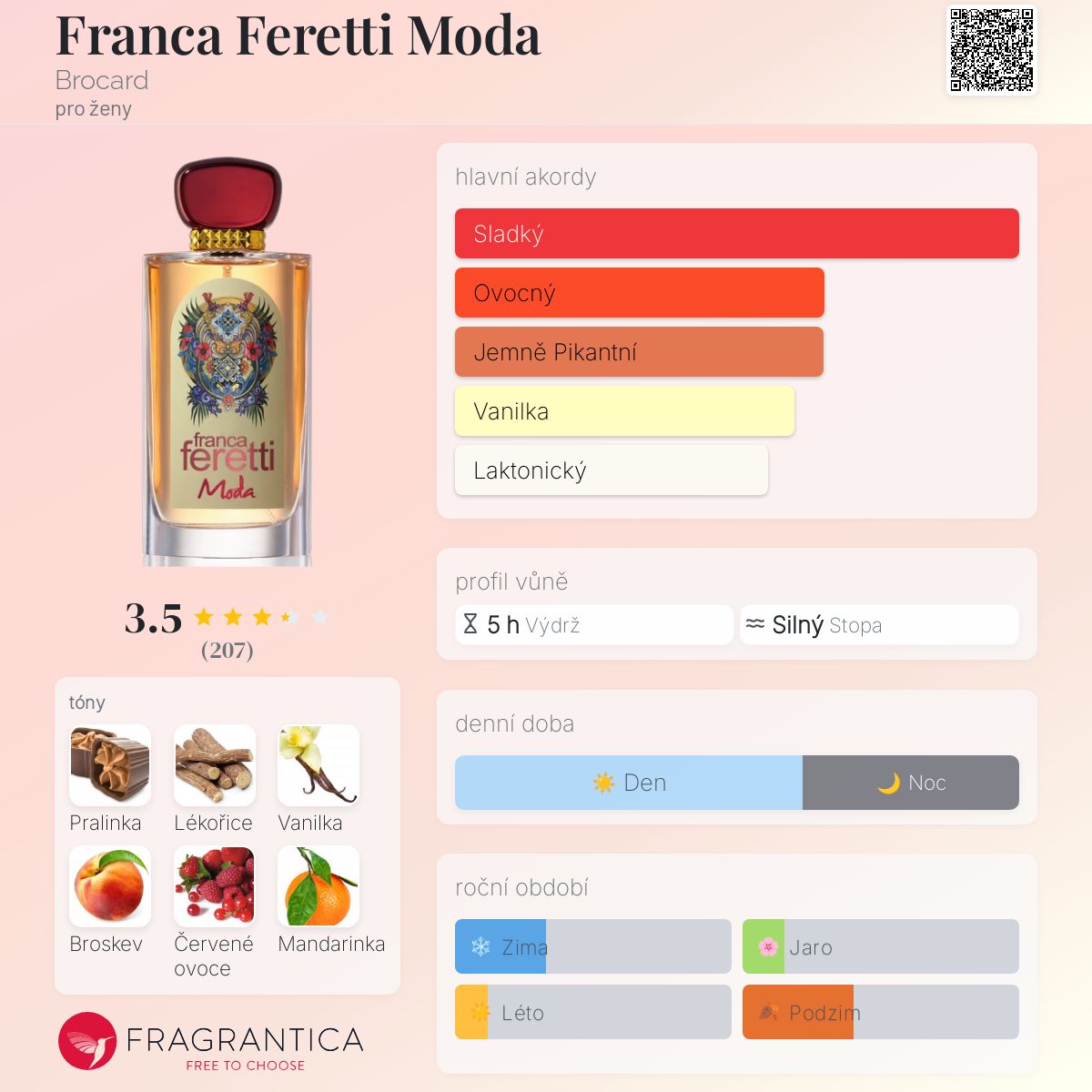 Franca Feretti Moda podle Brocard je Floral Fruity Gourmand vůně pro ženy. Franca Feretti Moda byl/a uveden/a v roce 2018. "Nosem" za touto vůní je Honorine Blanc.