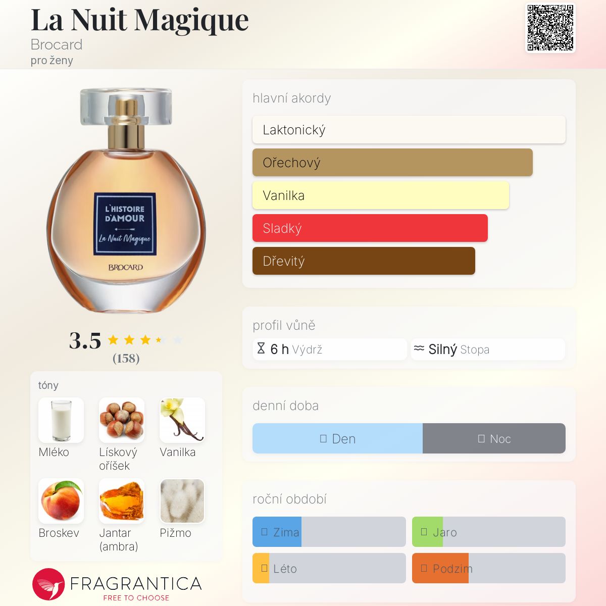 La Nuit Magique podle Brocard je Orientální Vanilla vůně pro ženy. La Nuit Magique byl/a uveden/a v roce 2020. "Nosem" za touto vůní je Sophie Truitard. Vrchní tóny jsou Broskev, Frézie a Bergamot; střední tóny jsouMléko, Lískový oříšek, Lilie a Konvalinka ; základní tóny jsou Vanilka, Jantar (ambra), Pižmo a Cedr.