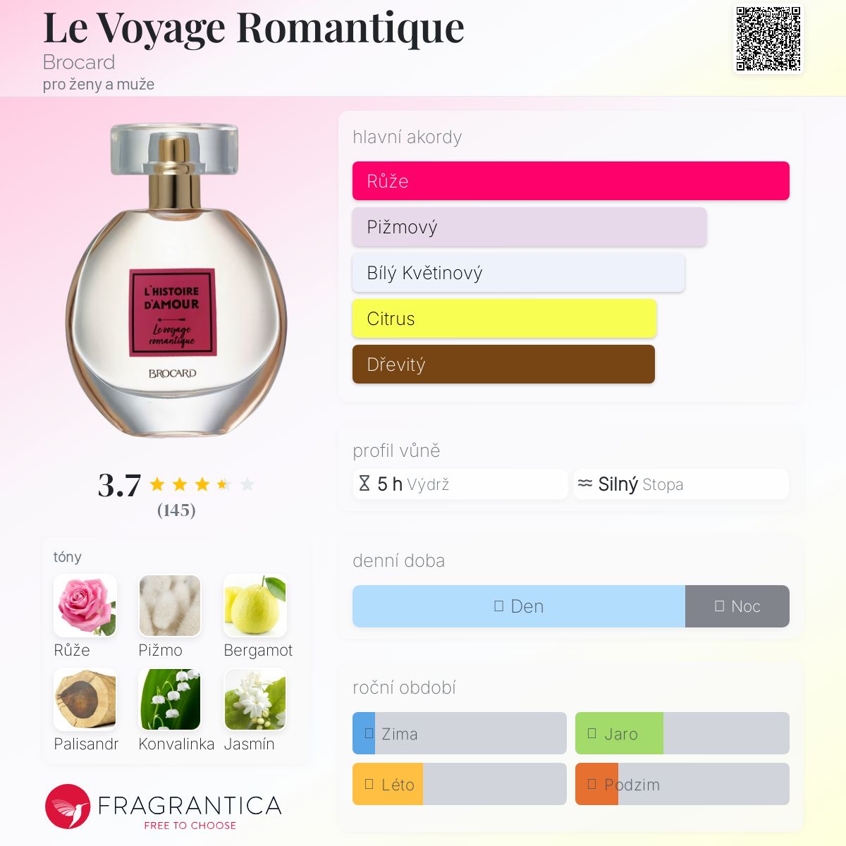 Le Voyage Romantique podle Brocard je Floral Fruity vůně pro ženy a muže. Le Voyage Romantique byl/a uveden/a v roce 2020. "Nosem" za touto vůní je Elke Doerrier. Vrchní tóny jsou Bergamot, Konvalinka a Jasmín; střední tóny jsouRůže a Palisandr ; základní tóny jsou Pižmo, Jantar (ambra) a Cedr.