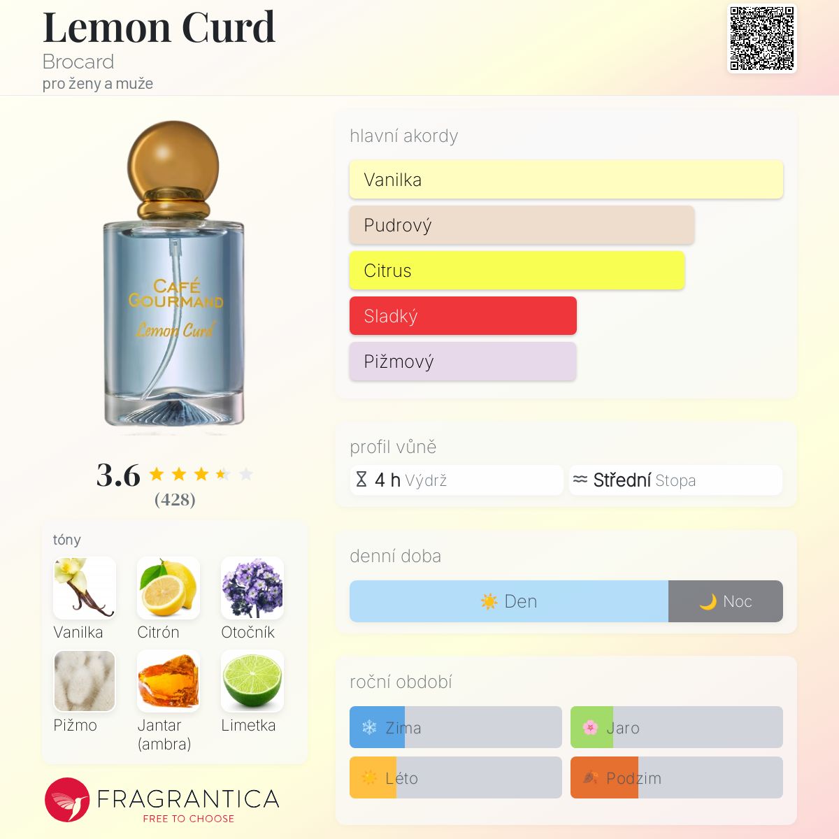 Lemon Curd podle Brocard je Floral Woody Musk vůně pro ženy a muže. Lemon Curd byl/a uveden/a v roce 2018. "Nosem" za touto vůní je Marine Ipert. Vrchní tóny jsou Citrón, Limetka, Jablko a Zelené tóny; střední tóny jsouVanilka, Otočník a Jasmín ; základní tóny jsou Pižmo, Jantar (ambra) a Cedr.