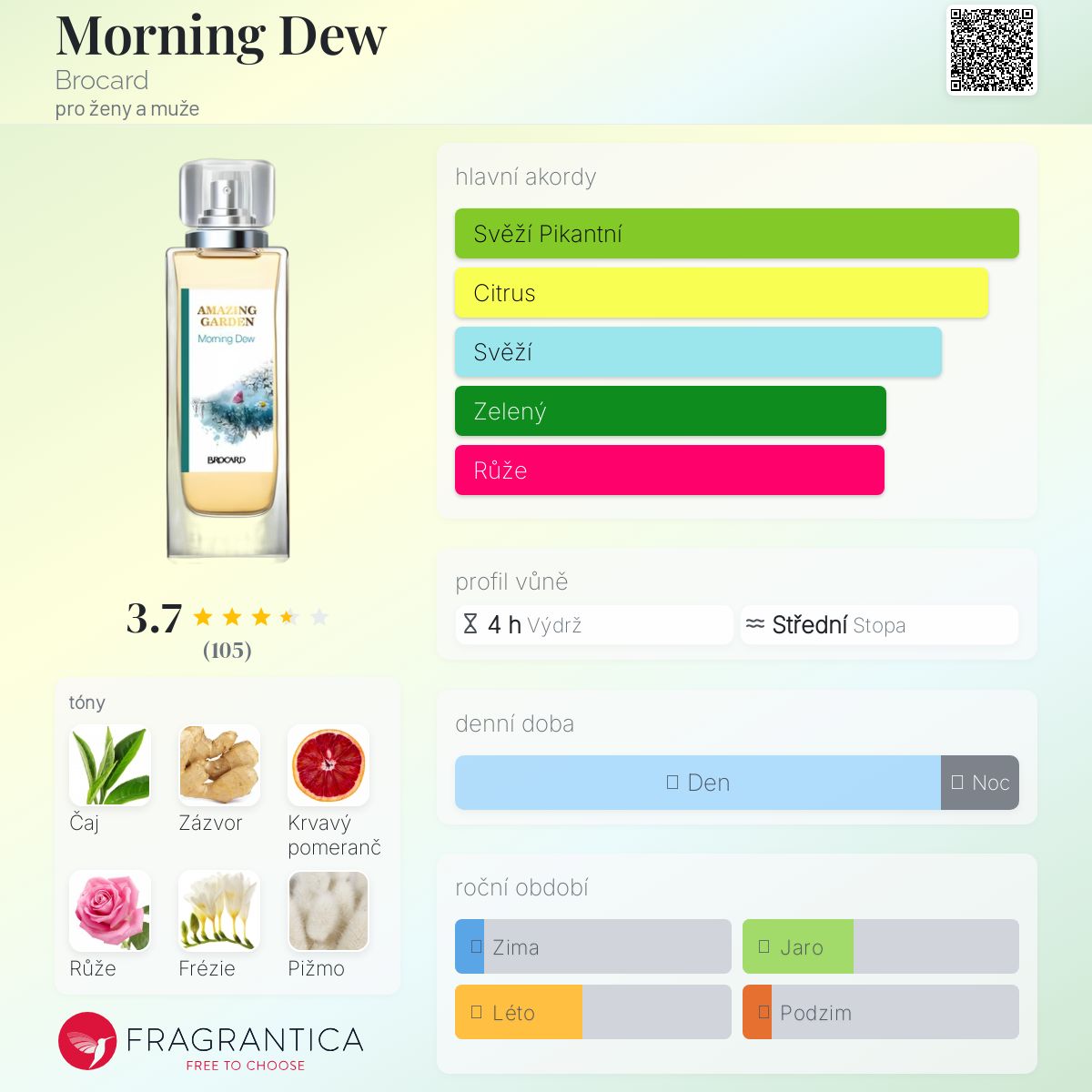 Morning Dew podle Brocard je Floral Green vůně pro ženy a muže. Morning Dew byl/a uveden/a v roce 2023. "Nosem" za touto vůní je Alexandra Carlin. Vrchní tóny jsou Bílý čaj a Krvavý pomeranč; střední tóny jsouZázvor, Růže a Frézie ; základní tón je Pižmo.
