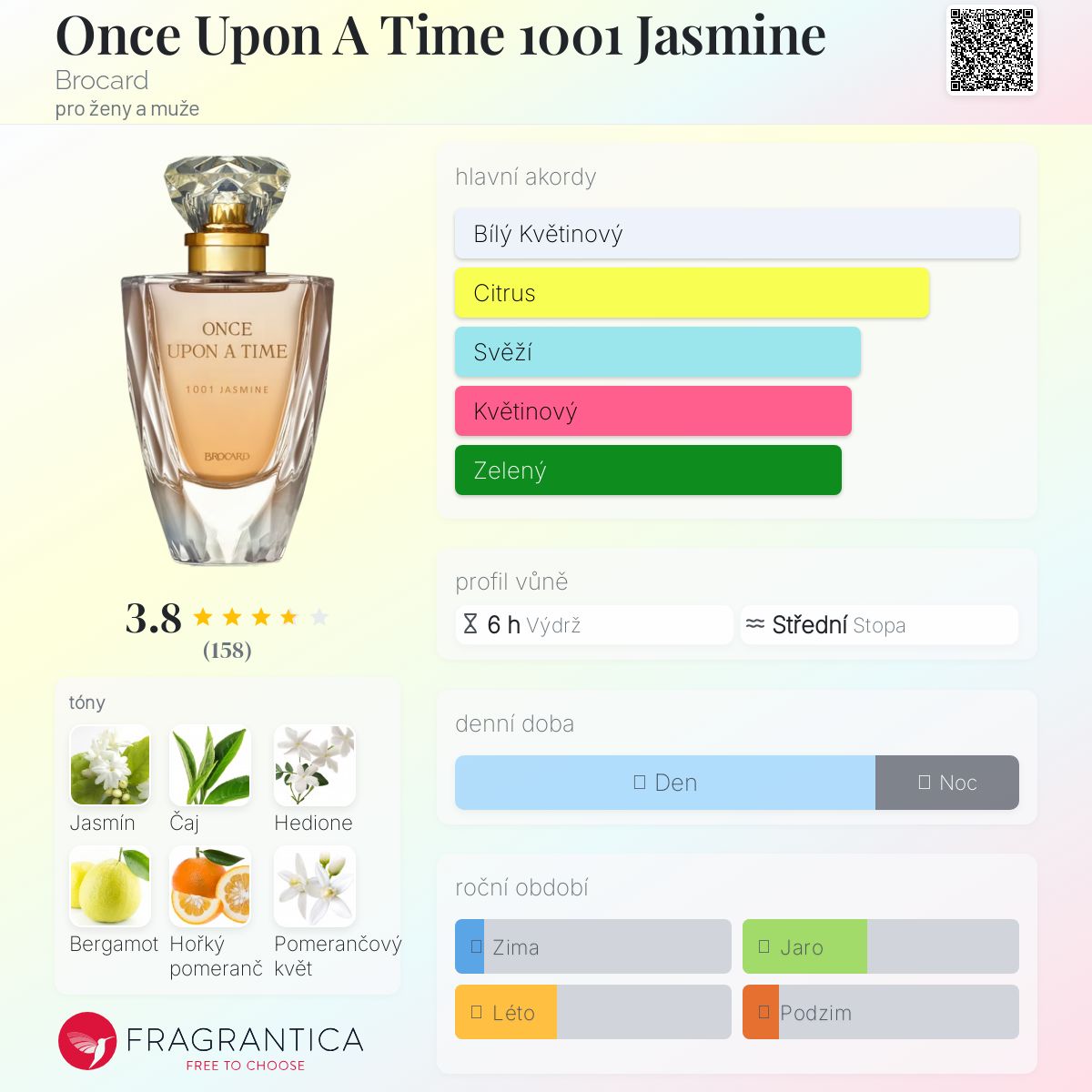 Once Upon A Time 1001 Jasmine podle Brocard je Floral vůně pro ženy a muže. Once Upon A Time 1001 Jasmine byl/a uveden/a v roce 2022. "Nosem" za touto vůní je Nicolaj Koralewicz. Vrchní tóny jsou Zelený čaj, Hedione, Bergamot a Hořký pomeranč; střední tóny jsouJasmín Sambac, Egyptský jasmín, Pomerančový květ a Ylang-Ylang ; základní tóny jsou Pižmo, Jantar (ambra) a Cedr.