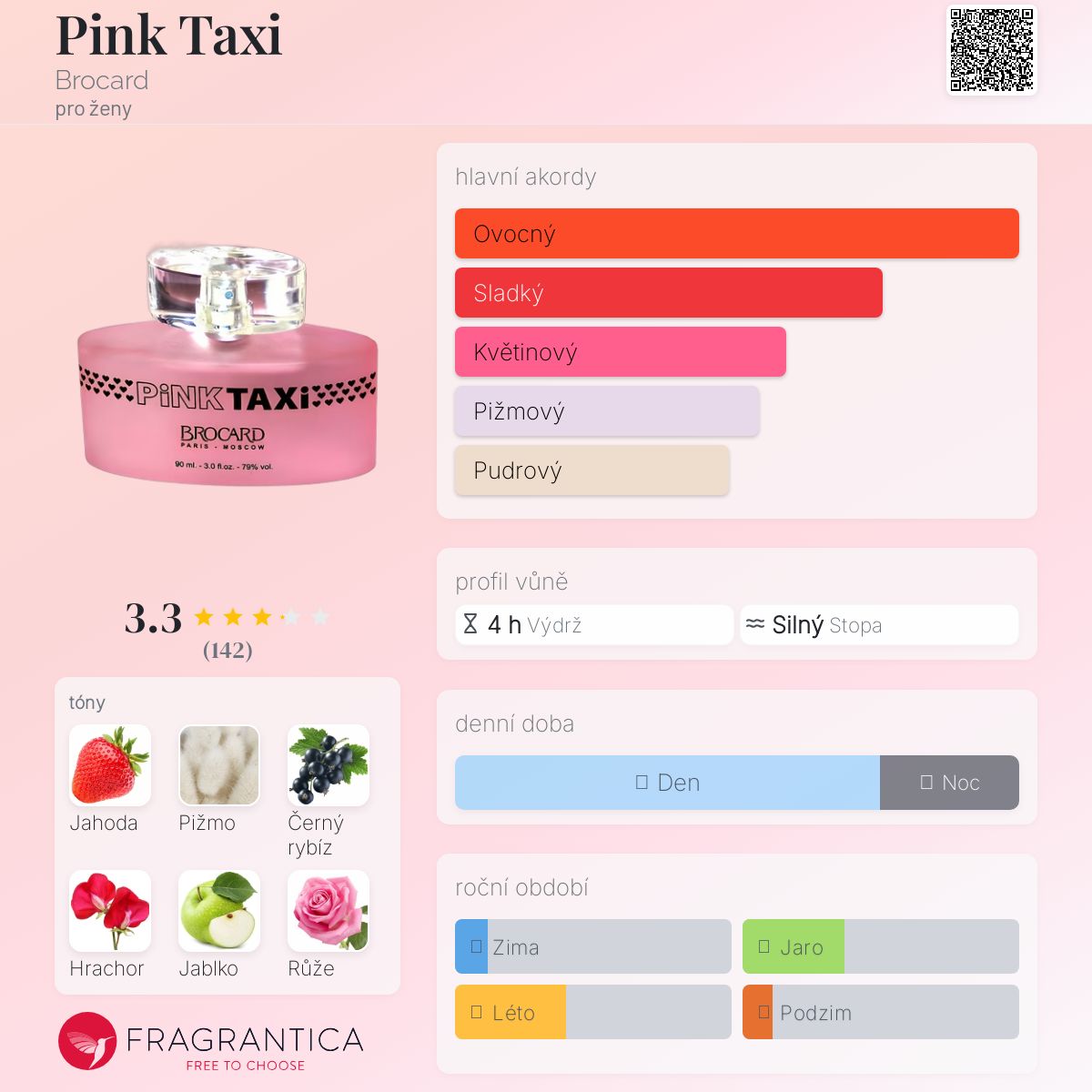 Pink Taxi podle Brocard je Floral Fruity vůně pro ženy. Pink Taxi byl/a uveden/a v roce 2000. Vrchní tóny jsou Jahoda, Černý rybíz a Jablko; střední tóny jsouHrachor, Růže, Frézie a Jasmín ; základní tóny jsou Pižmo, Jantar (ambra) a Santalové dřevo.