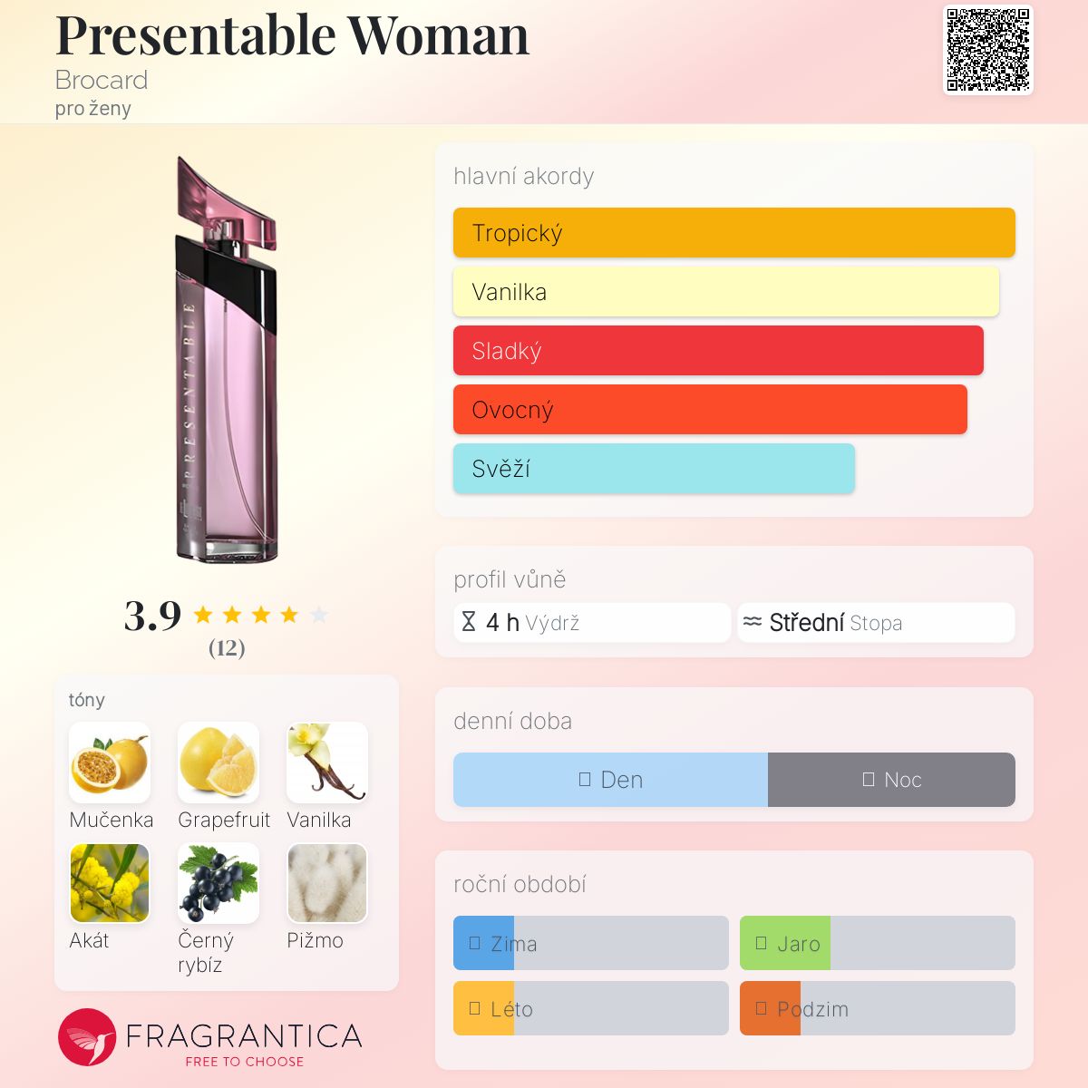 Presentable Woman podle Brocard je Floral Fruity vůně pro ženy. Presentable Woman byl/a uveden/a v roce 2020. Vrchní tóny jsou Grapefruit, Černý rybíz a Bergamot; střední tóny jsouMučenka, Akát a Jasmín ; základní tóny jsou Vanilka a Pižmo.