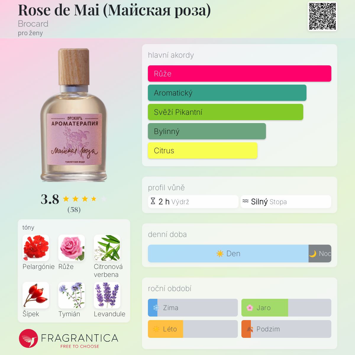 Rose de Mai (Майская роза) podle Brocard je Floral vůně pro ženy. Rose de Mai (Майская роза) byl/a uveden/a v roce 2019. "Nosem" za touto vůní je Morgane Collinot. Vrchní tóny jsou Okvětní lístky růží, Citronová verbena a Levandule; střední tóny jsouRůže de Mai, Šípek, Tymián a Oregano ; základní tóny jsou Geranium růže a Pačuli.