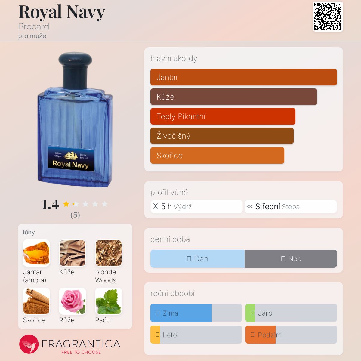 Royal Navy podle Brocard je Woody Spicy vůně pro muže. Toto je nová vůně. Royal Navy byl/a uveden/a v roce 2024. Vrchní tóny jsou Pomeranč, Grapefruit a Máta; střední tóny jsouSkořice, Růže a Pačuli ; základní tóny jsou Jemný jantar (ambra), Kůže a Světlá dřeva.