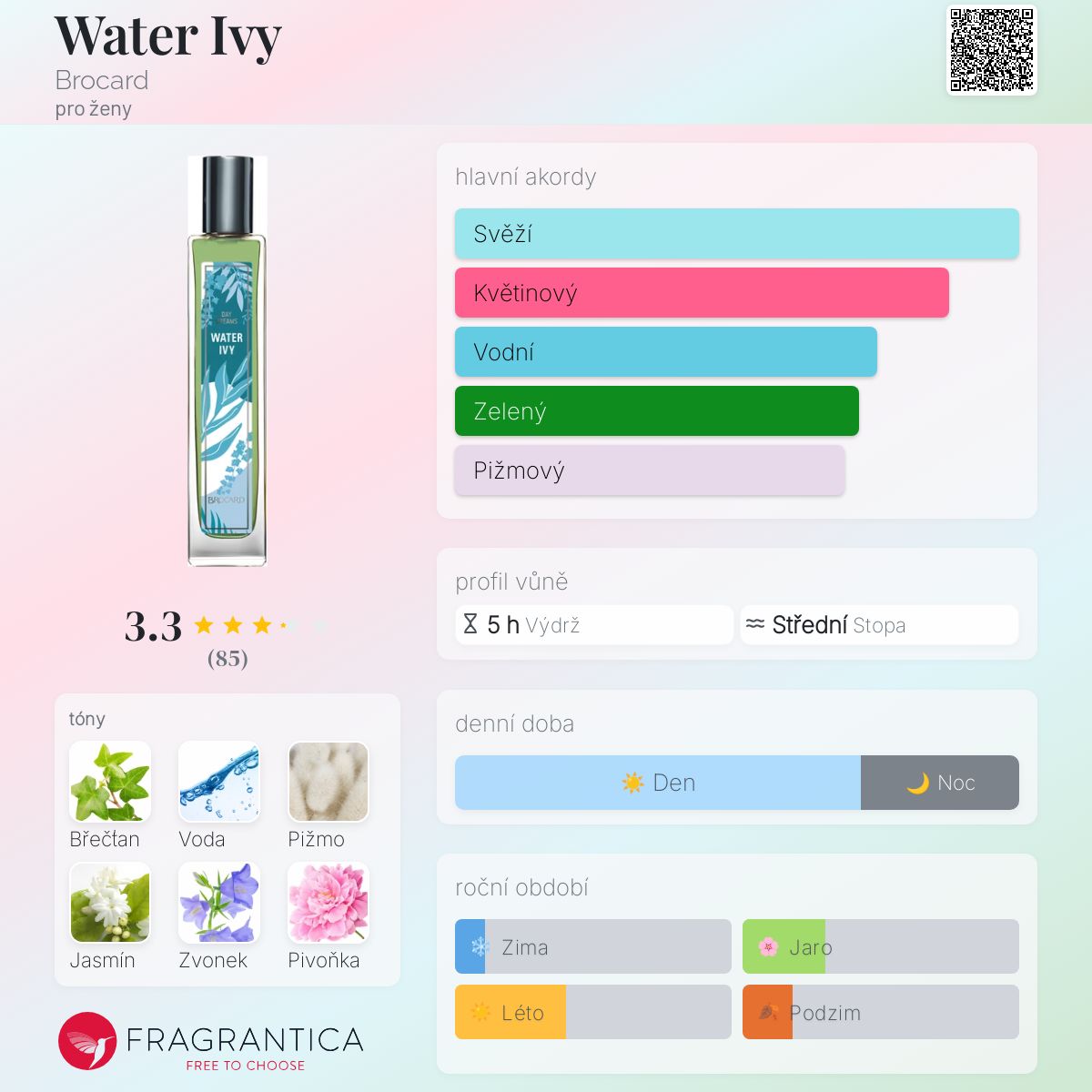 Water Ivy podle Brocard je Floral Aquatic vůně pro ženy. Water Ivy byl/a uveden/a v roce 2021. "Nosem" za touto vůní je Patrice Martin. Vrchní tóny jsou Vodnaté tóny, Bergamot a Broskev; střední tóny jsouBřečťan, Jasmín, Zvonek a Pivoňka ; základní tóny jsou Bílé pižmo a Mech.