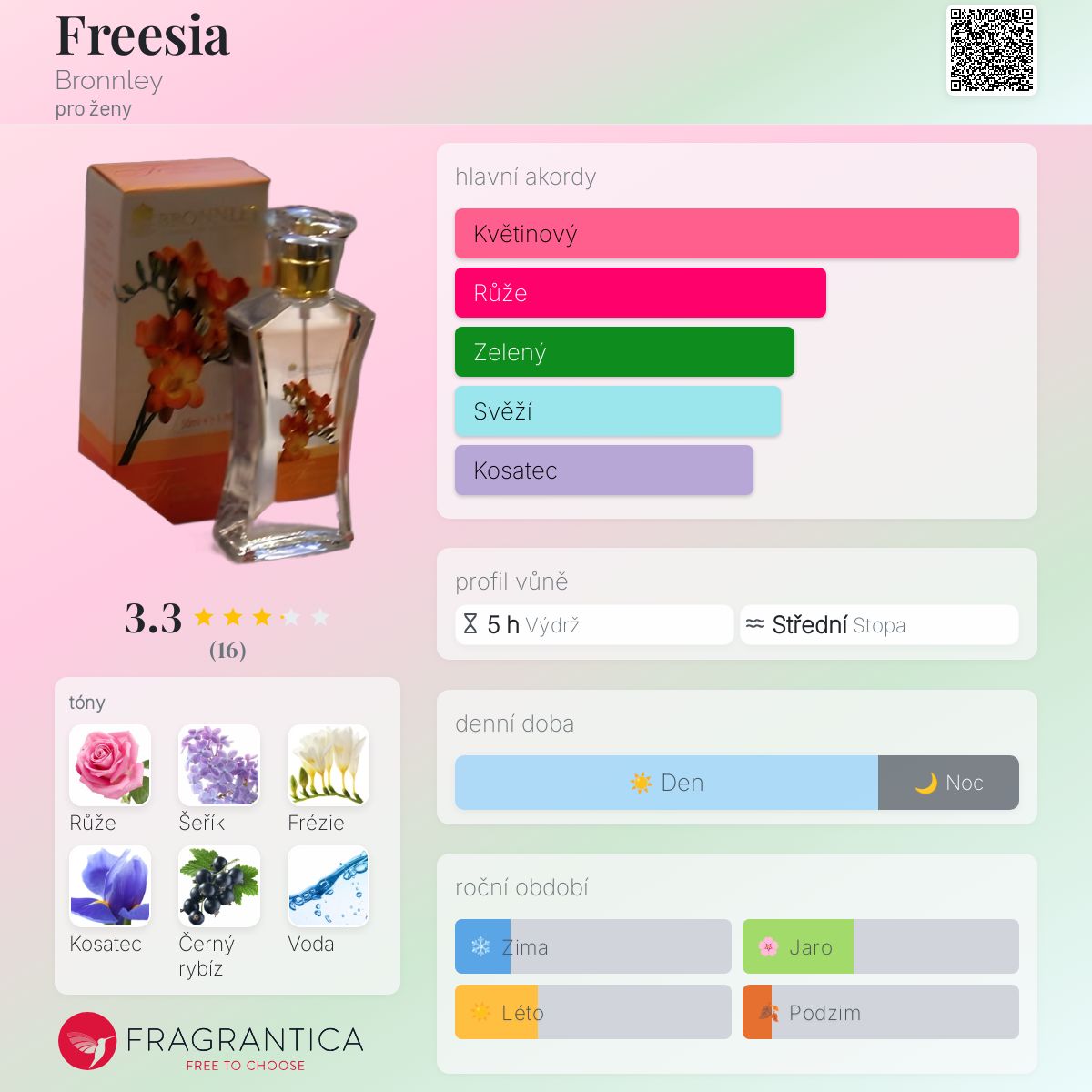 Freesia podle Bronnley je Floral vůně pro ženy. Freesia byl/a uveden/a v roce 2012. Vrchní tóny jsou Frézie, Černý rybíz, Vodnaté tóny a Zelené tóny; střední tóny jsouRůže, Šeřík a Kosatec ; základní tóny jsou Bílé pižmo a Jantar (ambra).