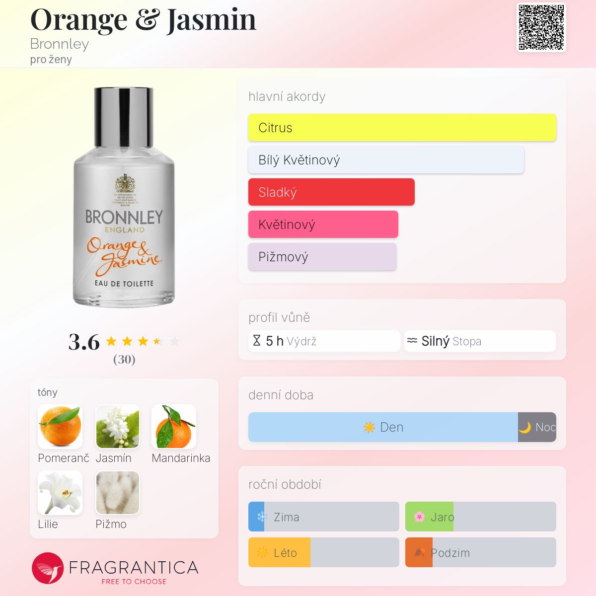 Orange & Jasmin podle Bronnley je Floral vůně pro ženy. Orange & Jasmin byl/a uveden/a v roce 2012. Vrchní tóny jsou Pomeranč a Mandarinka; střední tóny jsouJasmín a Lilie ; základní tón je Pižmo.