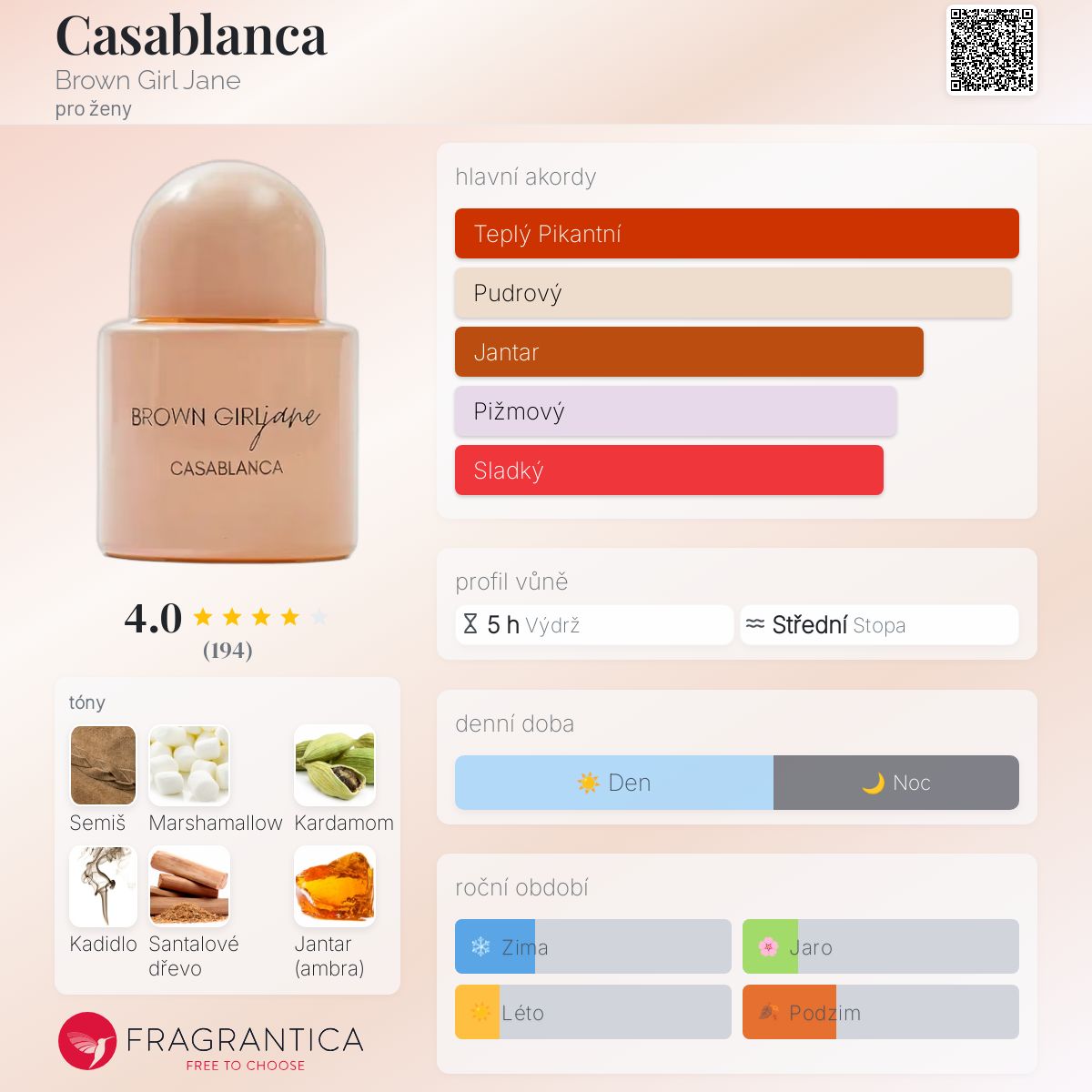 Casablanca podle Brown Girl Jane je Orientální Spicy vůně pro ženy. Casablanca byl/a uveden/a v roce 2022. "Nosem" za touto vůní je Clement Gavarry. Vrchní tóny jsou Marshmallow, Kardamom a Kadidlo; střední tóny jsouSemiš, Vanilková orchidej a Šafrán ; základní tóny jsou Santalové dřevo, Jantar (ambra) a Pižmo.