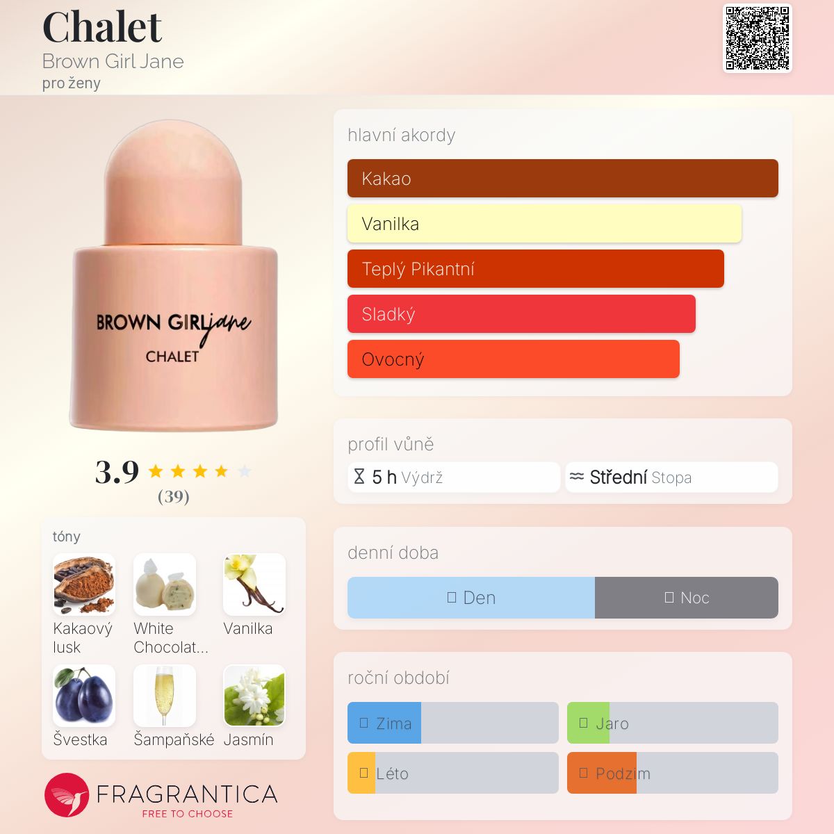 Chalet podle Brown Girl Jane je Orientální Vanilla vůně pro ženy. Toto je nová vůně. Chalet byl/a uveden/a v roce 2025. Vrchní tóny jsou Bílý čokoládový lanýž a Švestka; střední tóny jsouŠampaňské a Jasmín ; základní tóny jsou Kakao, Vanilka a Santalové dřevo.