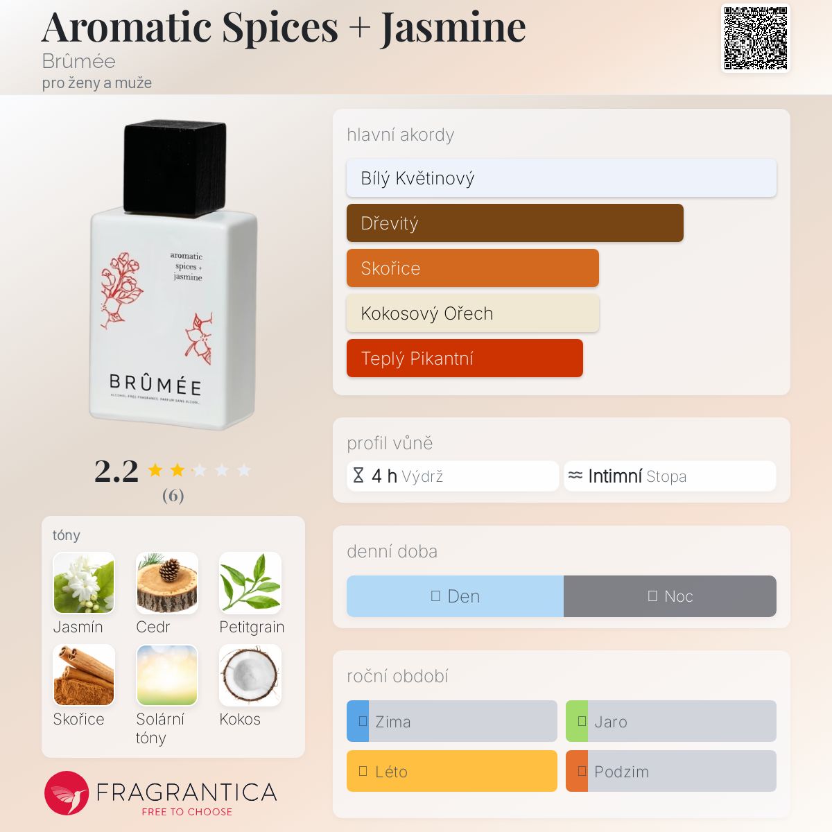 Aromatic Spices + Jasmine podle Brûmée je Floral Fruity vůně pro ženy a muže. Aromatic Spices + Jasmine byl/a uveden/a v roce 2021. Vrchní tóny jsou Citrón, Bergamot a Grapefruit; střední tóny jsouIndický jasmín, Cedr, Petitgrain a Skořice ; základní tóny jsou Solární tóny, Kokos a Broskev.