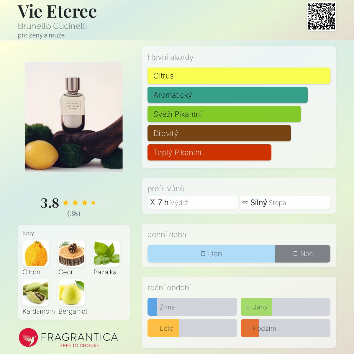 Vie Eteree podle Brunello Cucinelli je Woody Aromatic vůně pro ženy a muže. Toto je nová vůně. Vie Eteree byl/a uveden/a v roce 2024. "Nosem" za touto vůní je Benoist Lapouza. Vrchní tóny jsou Citrón a Bergamot; střední tóny jsouCedr, Bazalka a Kardamom ; základní tón je Virginský cedr.